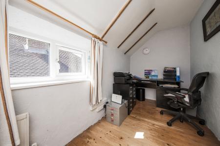 BEDROOM/STUDY: Wardrobe cupboard, fitted wall unit with shelving, recessed fireplace, exposed floorboards, radiator and window to front.