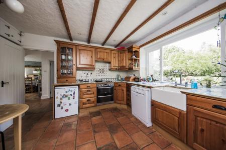 KITCHEN: Range of country style wall and base units with tiled worktops/splashback over and incorporating a Butler sink. Appliances include a new inset oven with ceramic hob and extractor fan over, space for dishwasher and washing machine. Wall cupboards with shelving, recess exposed brick area with beamed ceiling, column radiator and window to front.