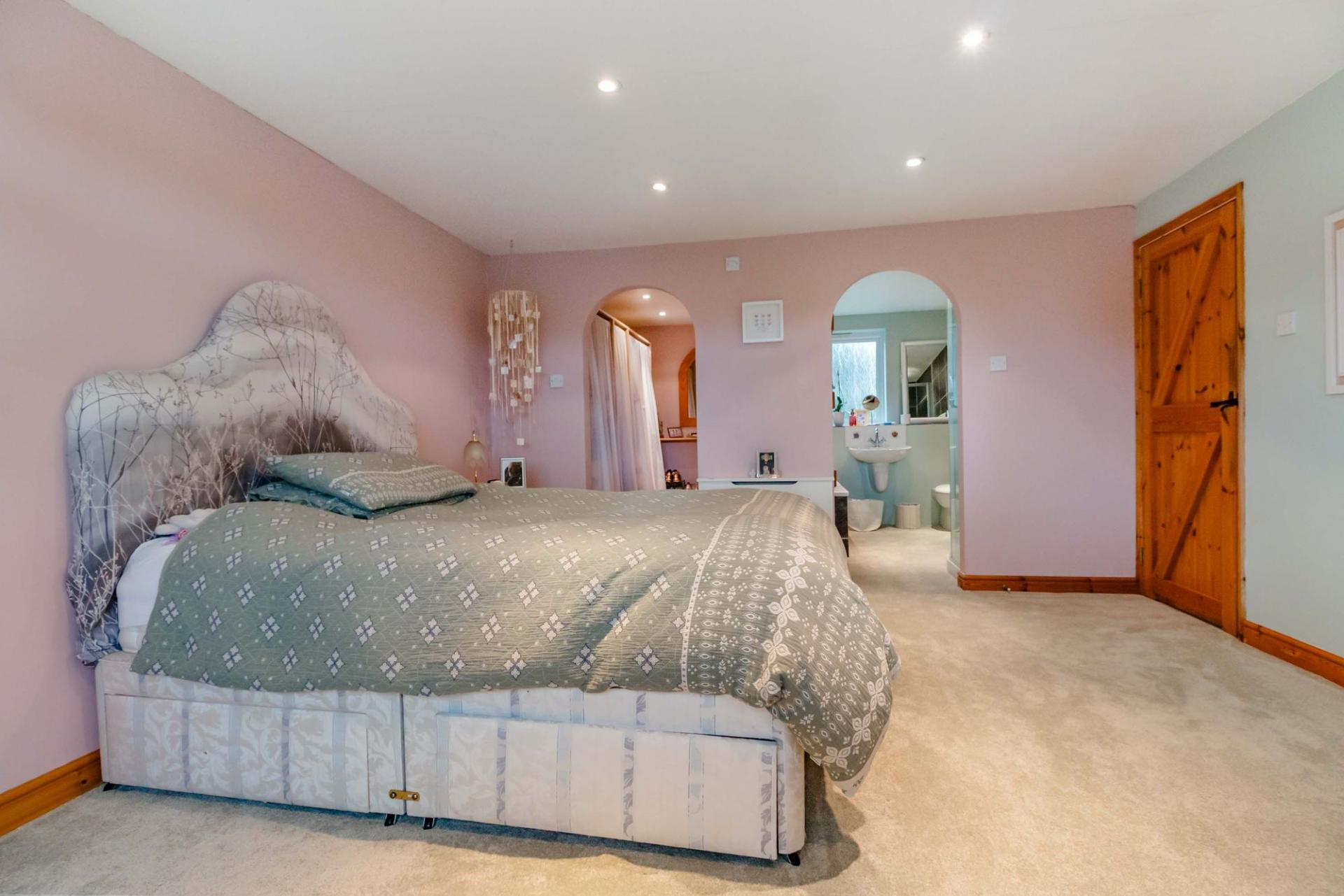 From the entrance hall a staircase rises to the first floor, offering; an impressive principle bedroom suite with a four-piece en-suite bathroom with separate shower cubicle and walk-in wardrobe, three further double bedrooms and a family bathroom with a shower above the bath.