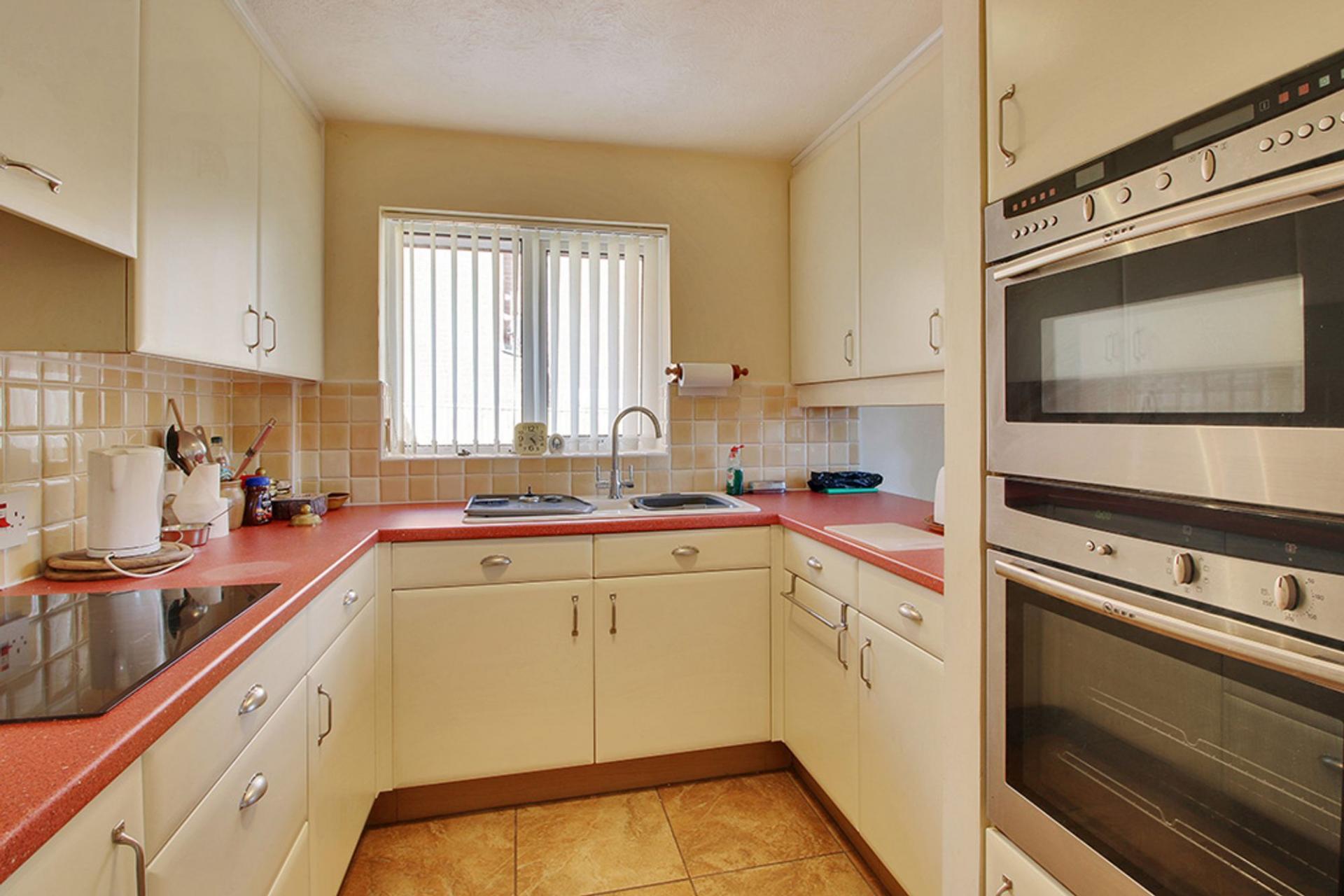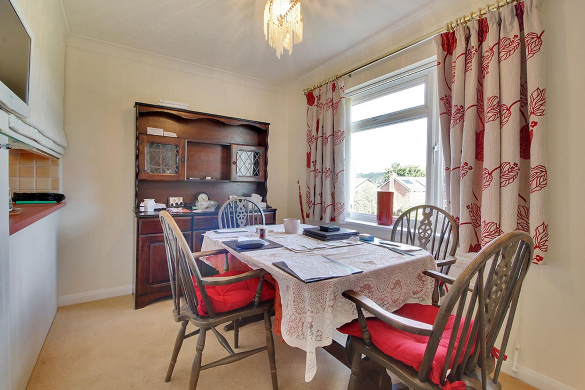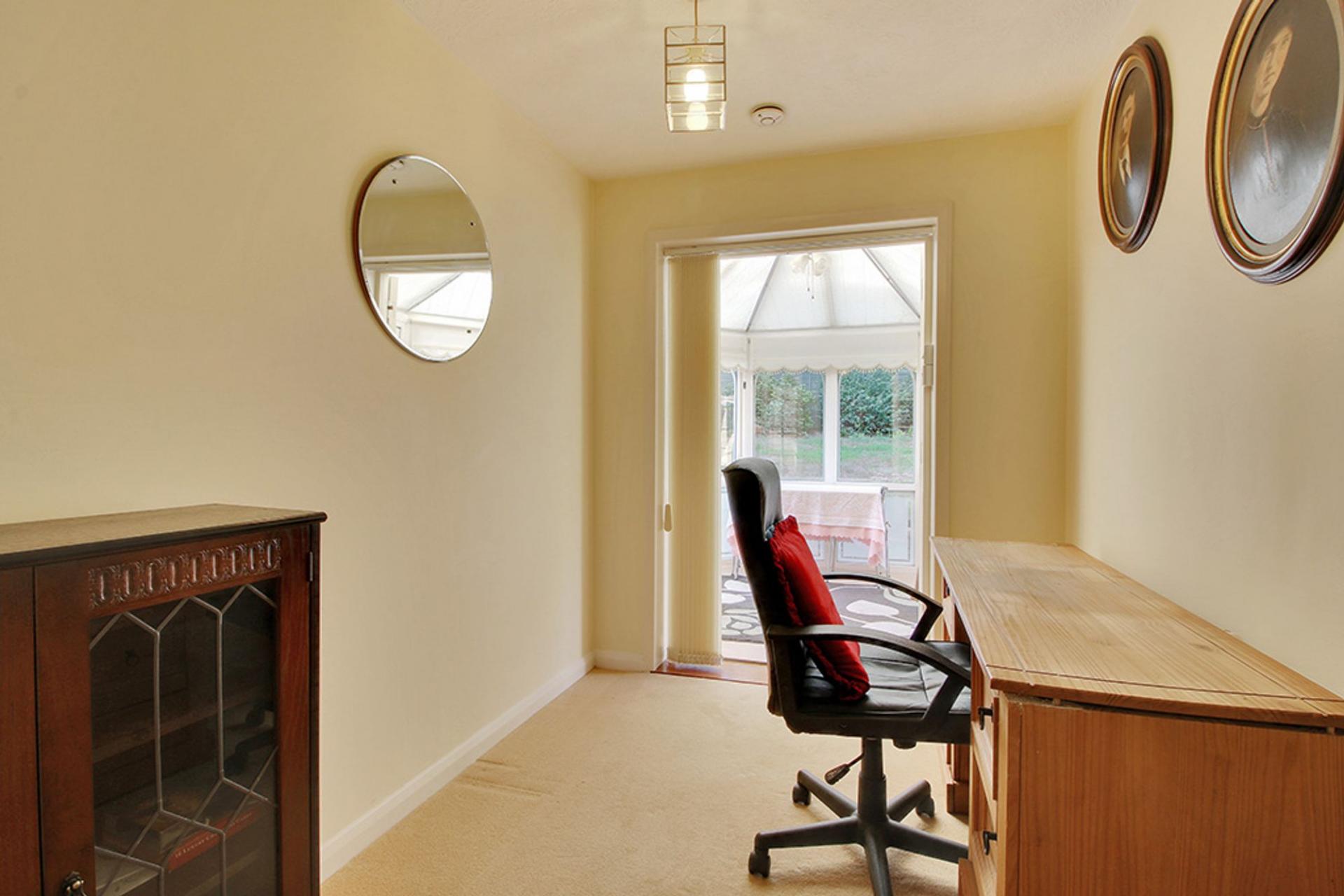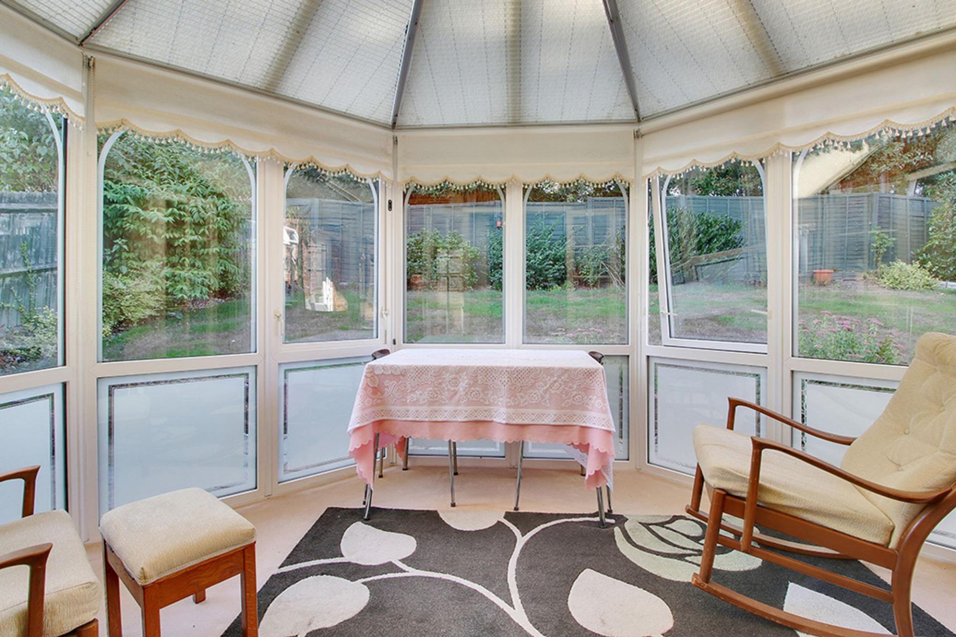 This well presented home boasts a fine outlook to both the front and rear with far reaching views across the communal green and countryside beyond to the front and a wooded area to the rear and benefits from, in brief; a modern kitchen with a range of matching units to eye and base level, a spacious dining area with a large window enjoying a delightful outlook across the communal green, a living room offering the same peaceful outlook, a principle bedroom with a range of fitted wardrobes and pleasant outlook to the rear garden and trees beyond, a second double bedroom, a single bedroom/study with double doors opening to the conservatory which in turn has double doors to the outside seating terrace.