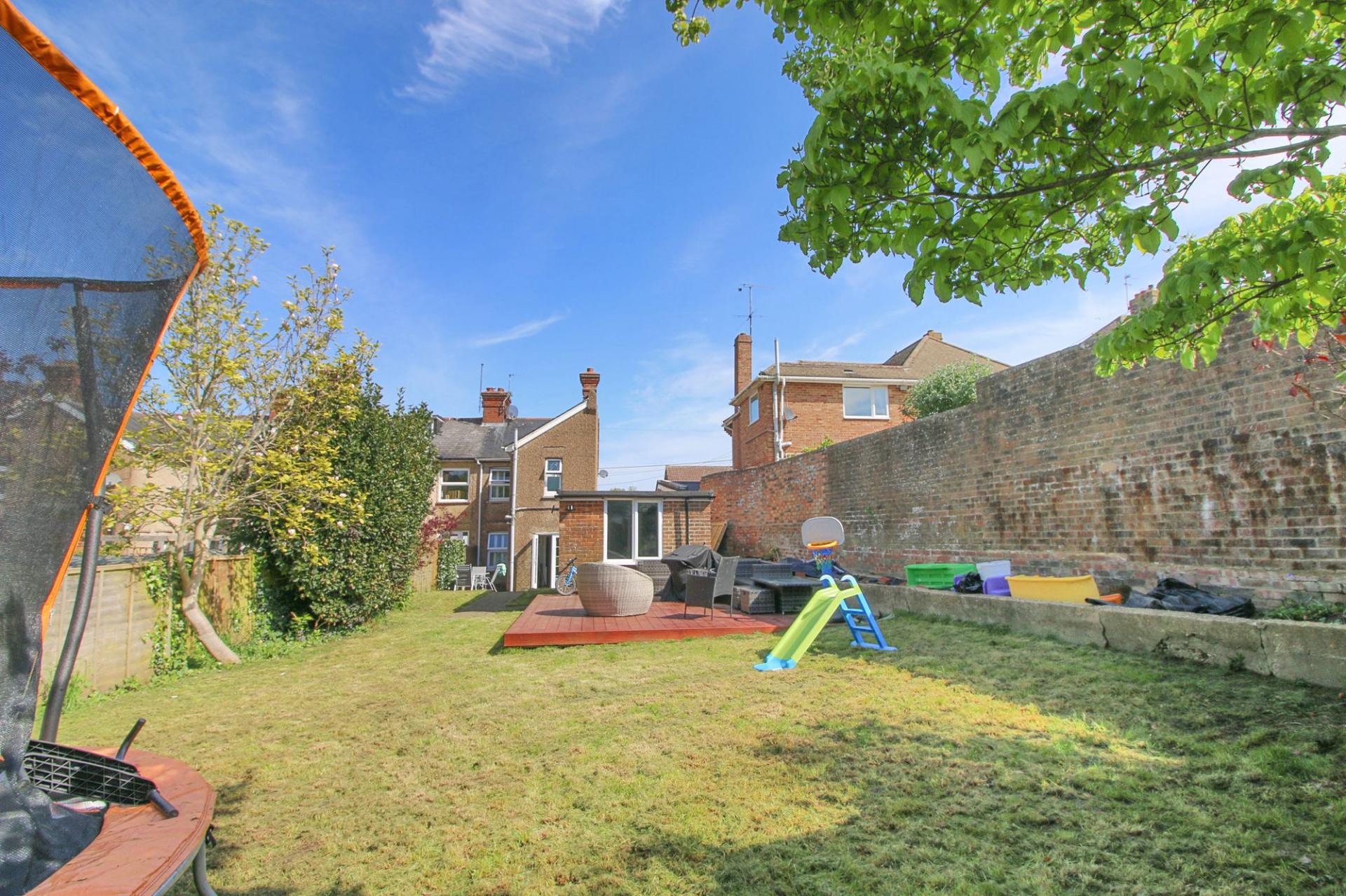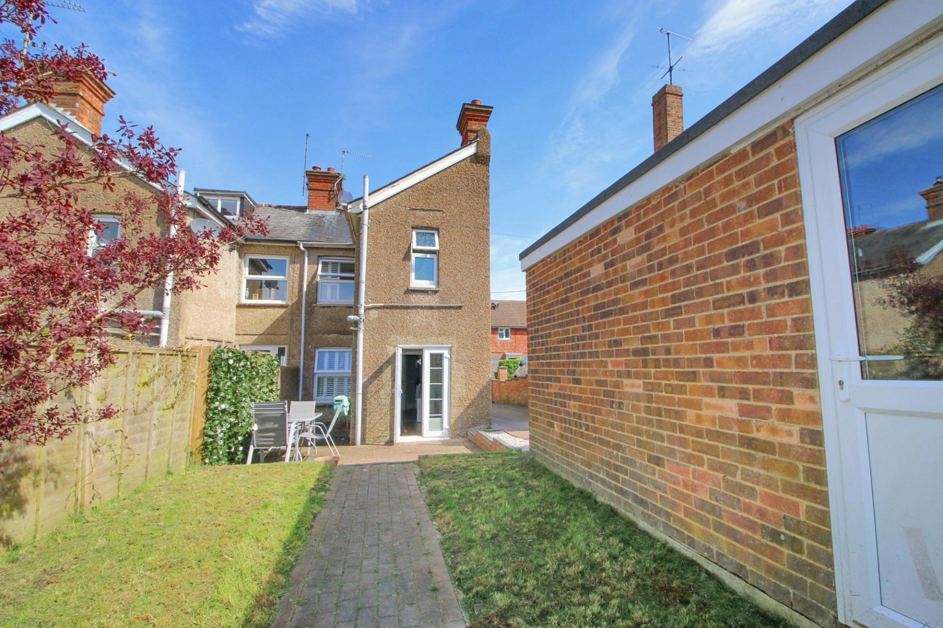 A 2 bedroom Victorian end of terrace family home, occupying a generous south facing corner plot with a driveway and detached garage. Situated within waking distance of the town centre and railway station.