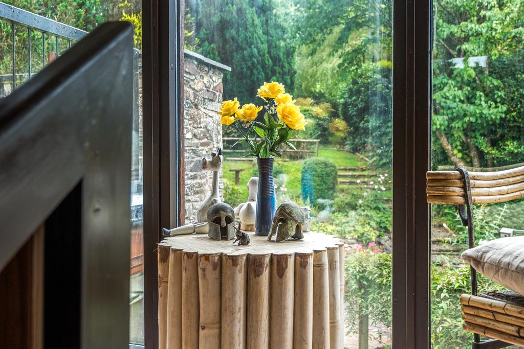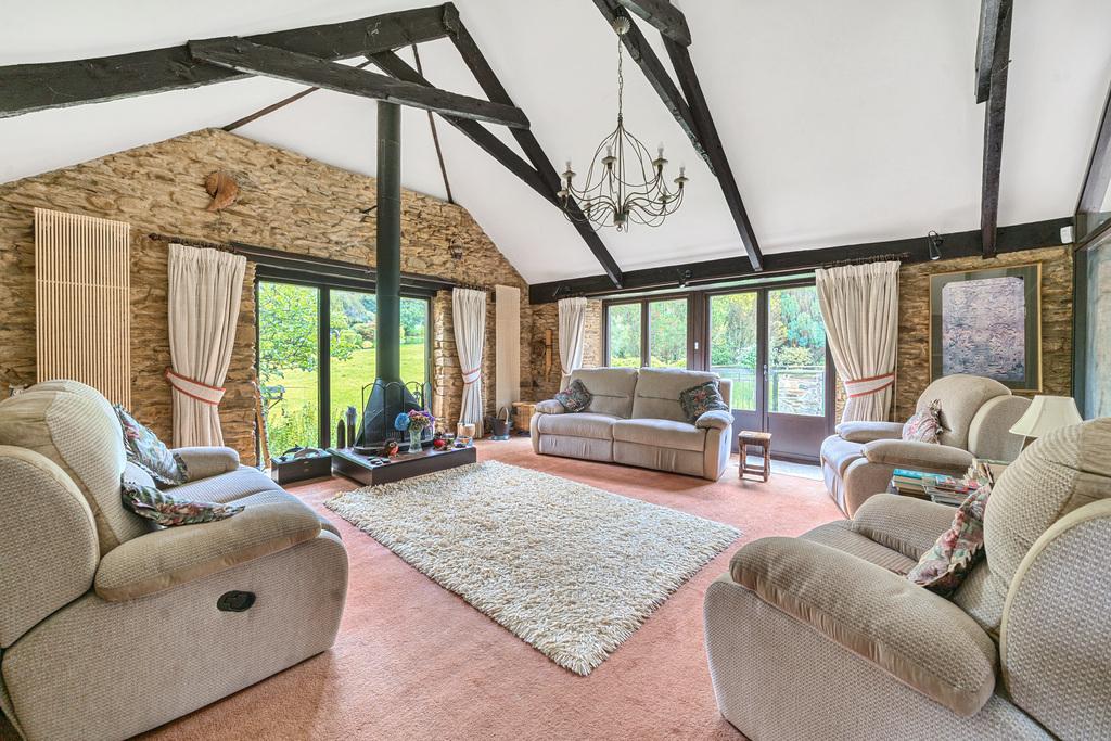 On the first floor in the master suite and impressive sitting room. Upon reaching the first floor landing, a wall of glass runs along the width of the sitting room, a fabulous display within its vaulted ceiling. The sitting room has a dual aspect with a wood burner centre piece, an array of exposed timbers and stone walls, with patio doors leading out onto a charming balcony. The master suite has a dual aspect, with fabulous views, and ensuite bathroom. A further shower room is positioned off the landing.