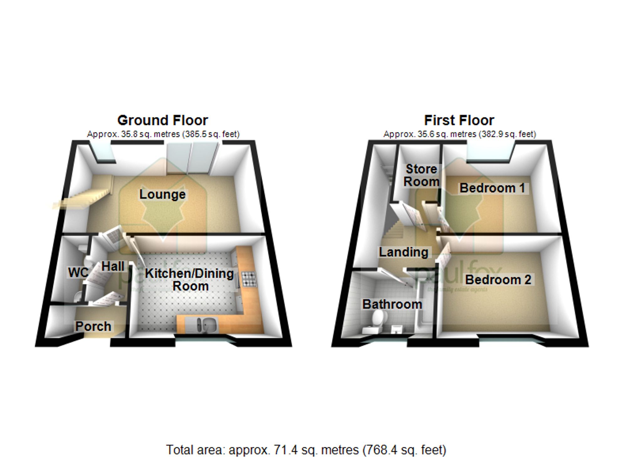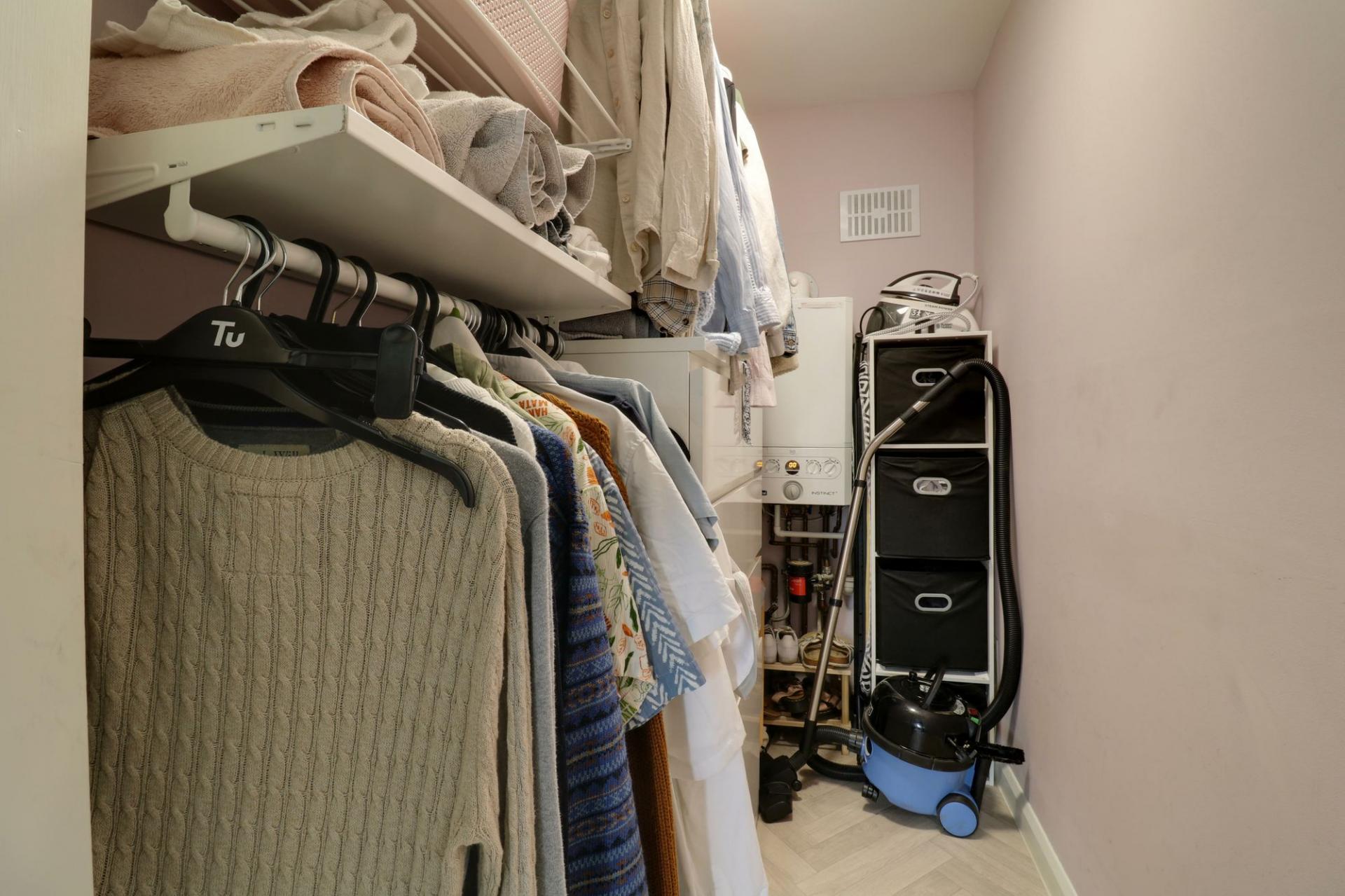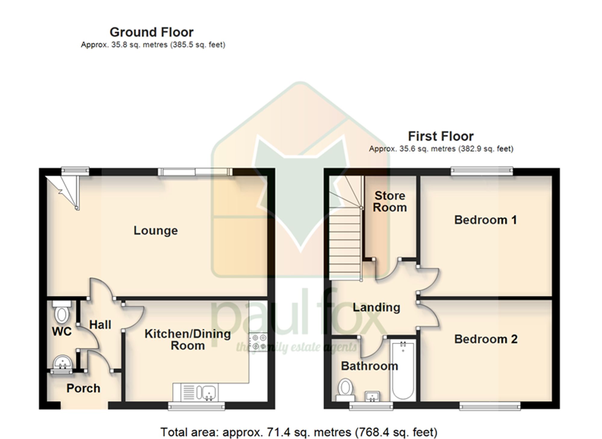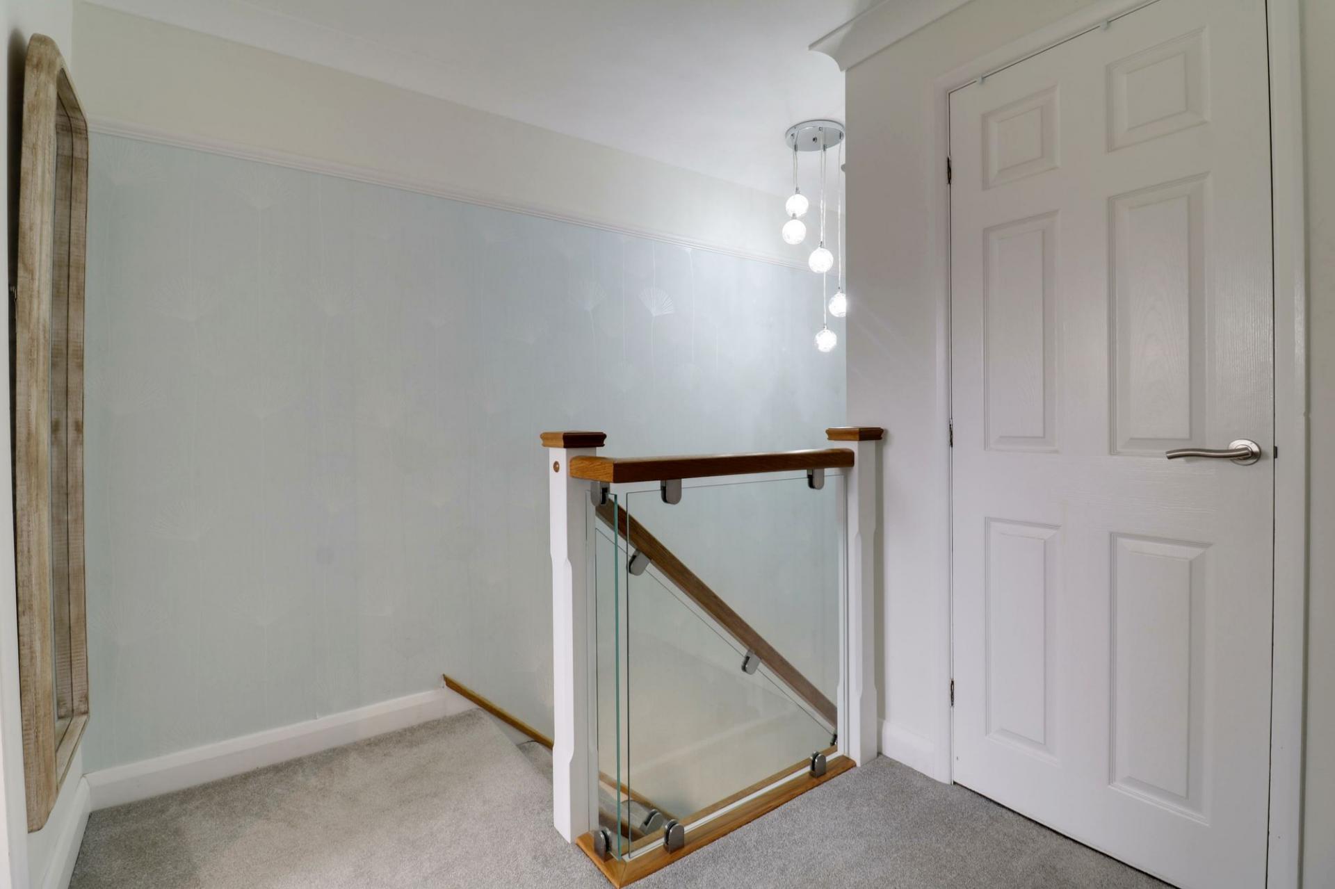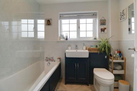 To the first floor, a central landing leads to two generously sized double bedrooms, alongside a useful storage room and a well-appointed three-piece family bathroom suite.