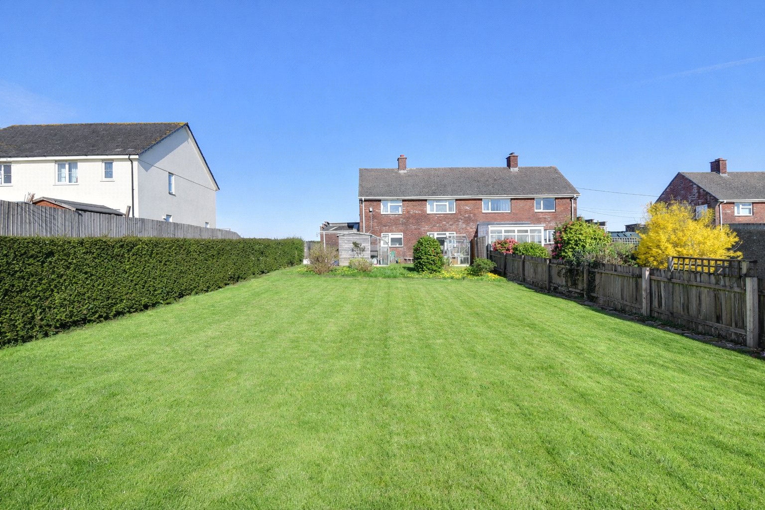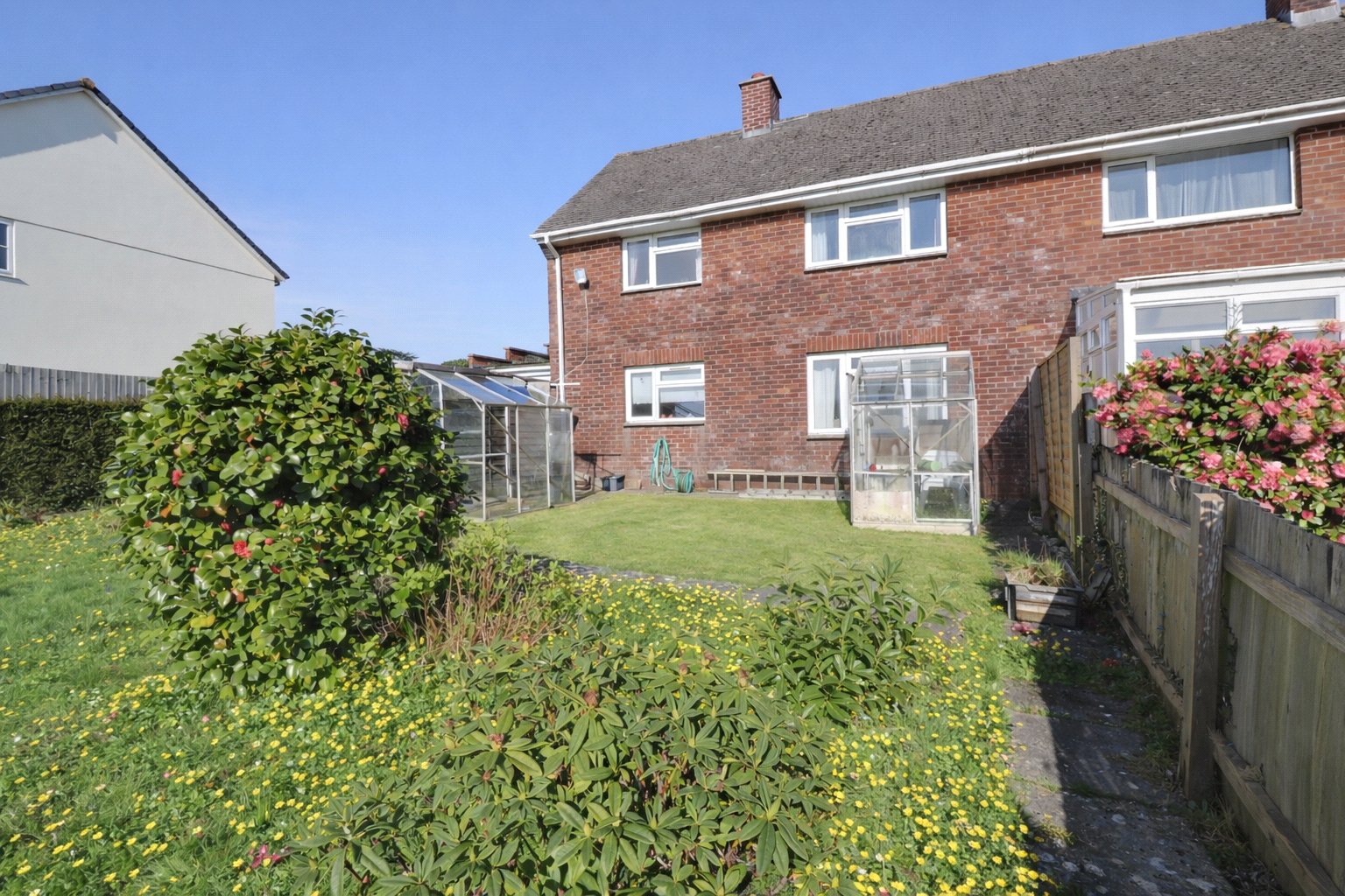 Outside, the rear garden is a particularly attractive part of the property. It is long, enclosed and mainly laid to lawn, offering plenty of room for gardening, outdoor seating or simply enjoying the peaceful setting. There is also a patio area, two greenhouses, storage sheds and a selection of mature shrubs and plants, creating a garden with both space and established character. A garage with up and over door is located to the rear and side of the house within a block of four.