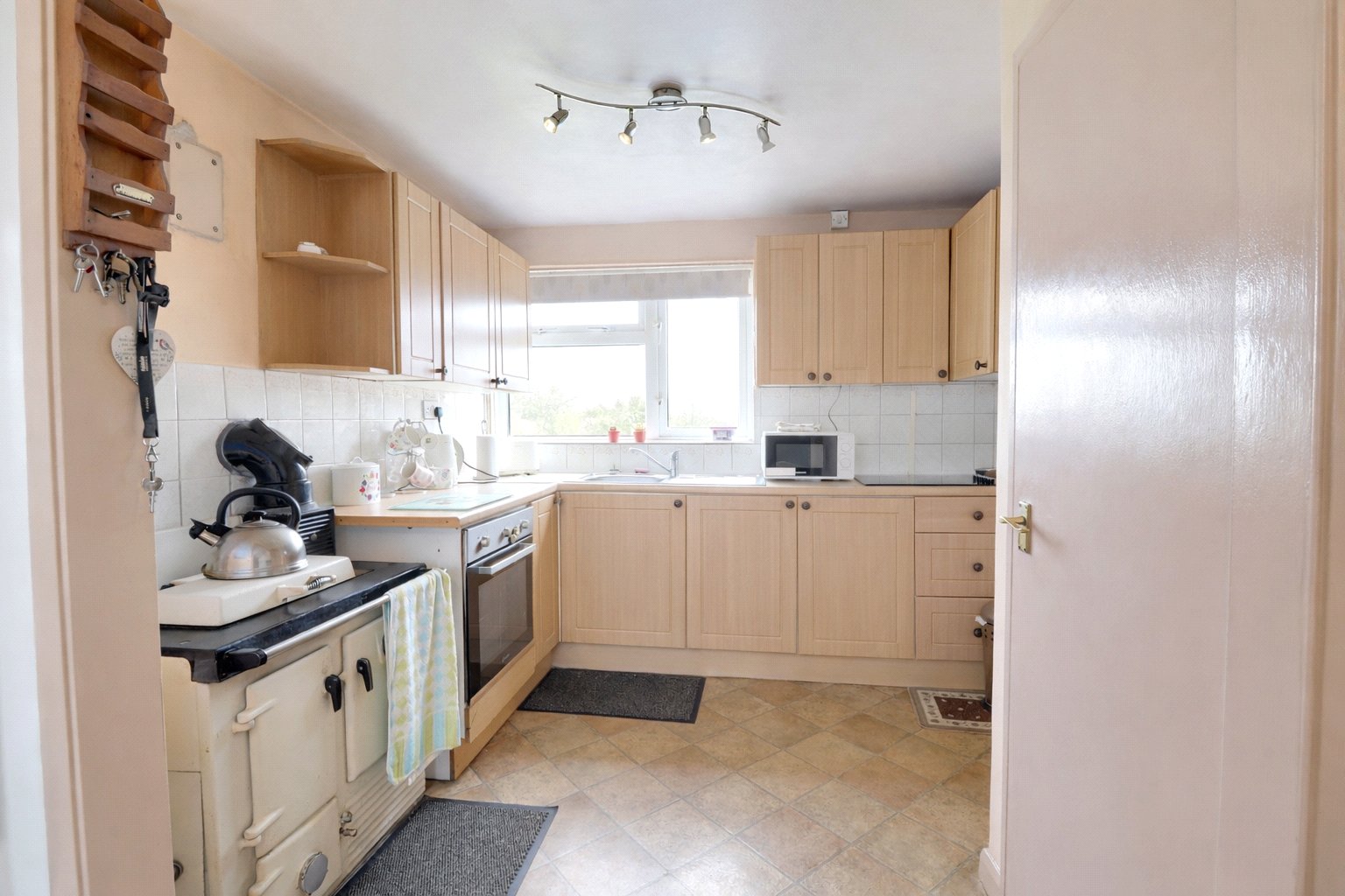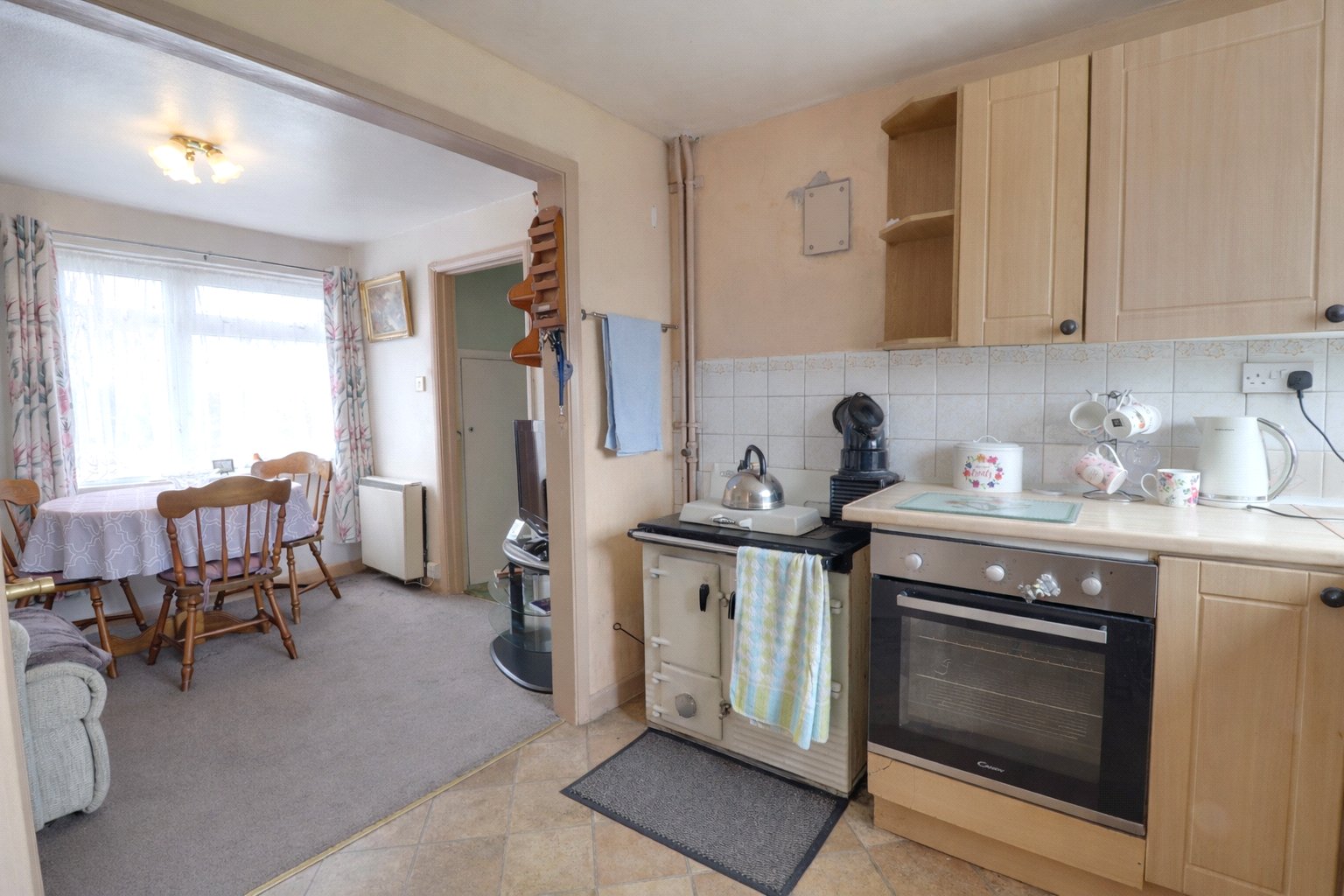 The sitting room is a light and cosy reception space, offering a comfortable room for day to day living. At the opposite end of the house, the kitchen and dining room provides a more sociable hub to the home, with space to gather around the table and enjoy views out over the garden. The kitchen is fitted with matching wall and base units and includes an Aga, an additional electric oven and hob, and an inset sink. A useful storage cupboard adds practicality, while the connection to the garden gives the room a pleasant outlook.