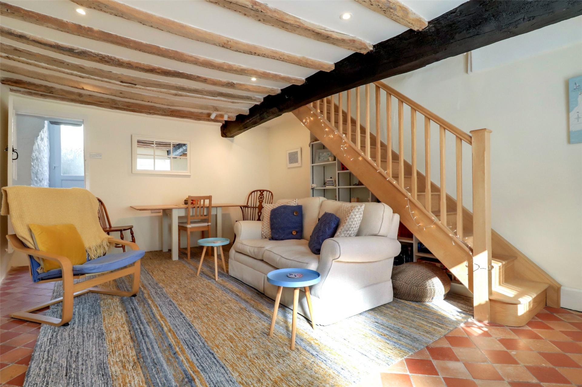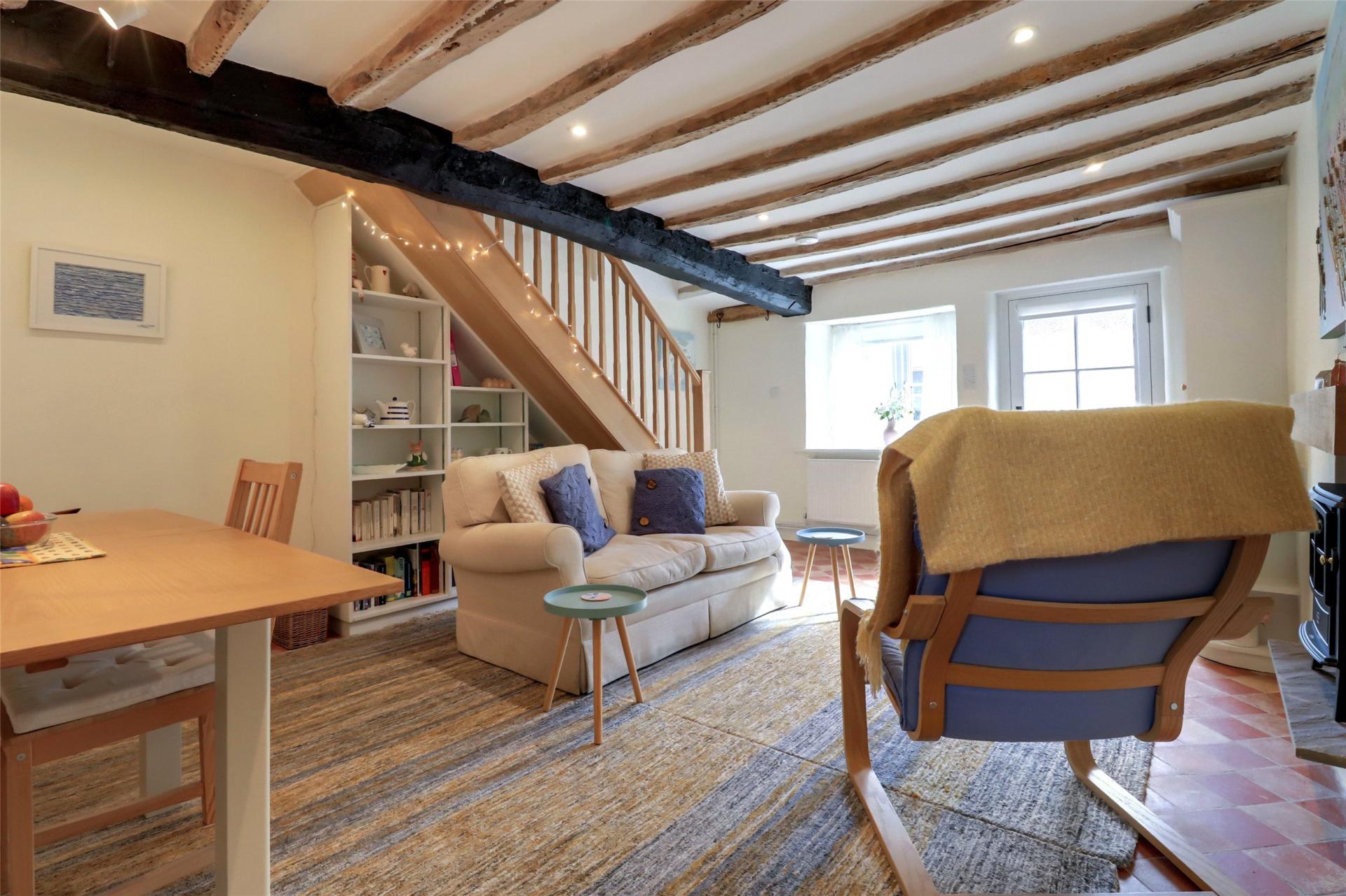 Steps rise from the pavement to the front door, which opens directly into a welcoming lounge/dining room, a generous space with plenty of room for both sitting and dining furniture. Exposed beams and a newly installed staircase add to the cottage's character, while its elevated position provides an attractive sense of privacy from the street.