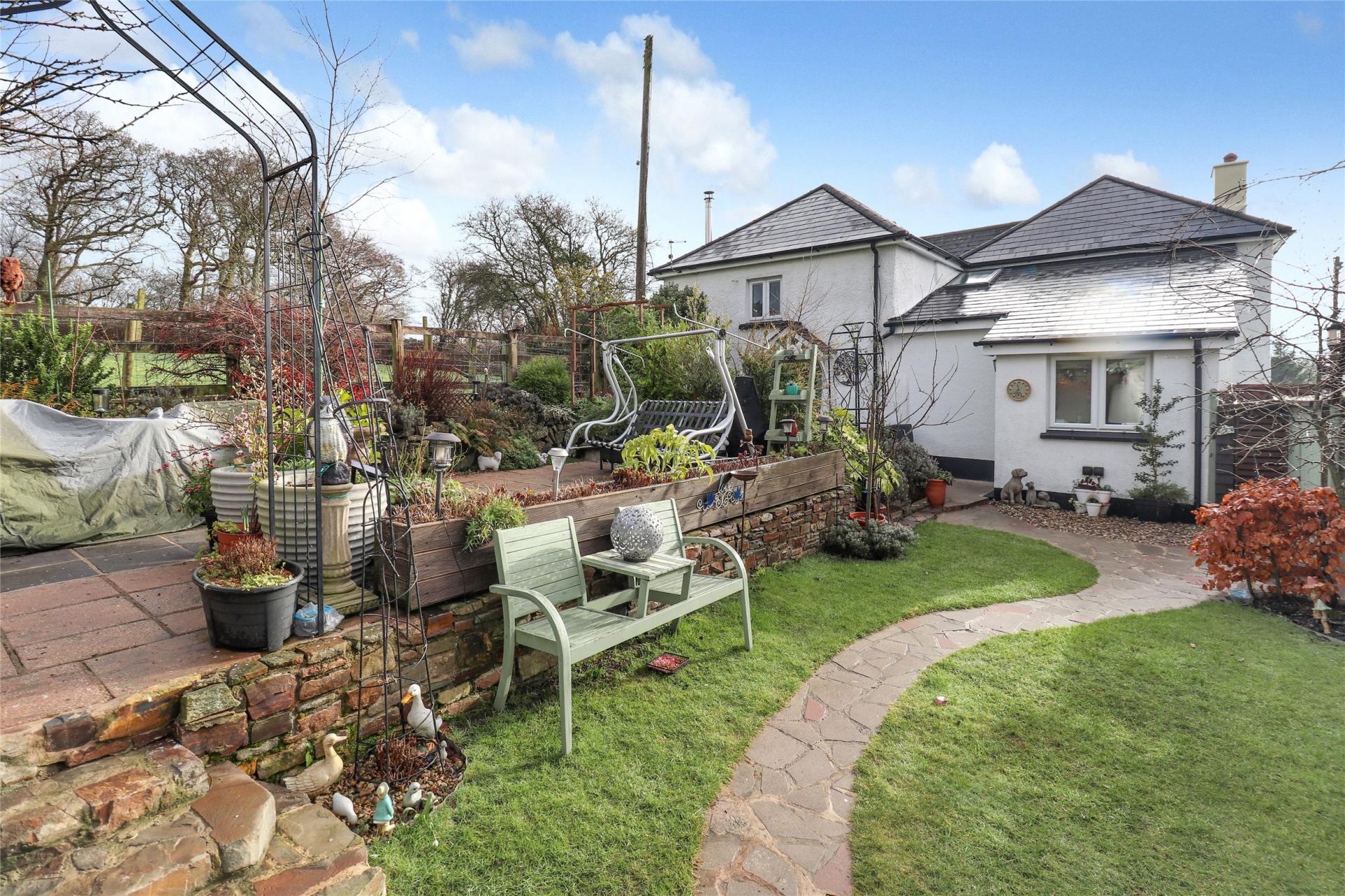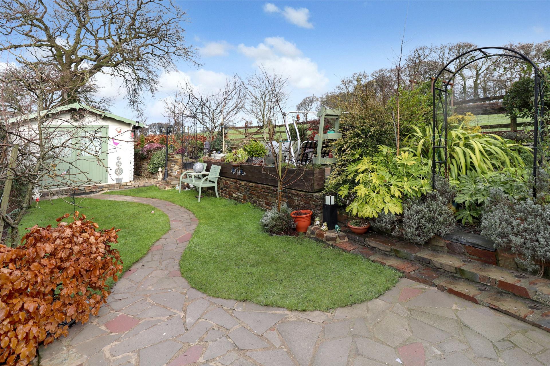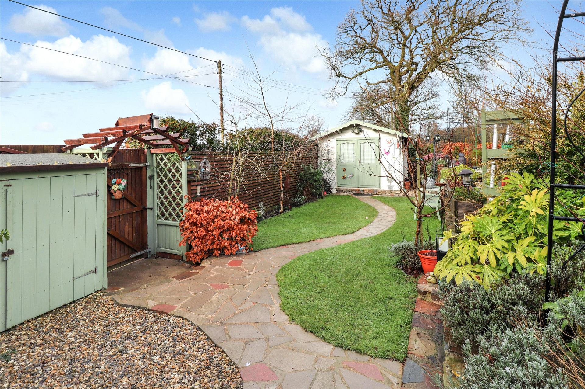The garden has been thoughtfully landscaped by the current owners and features a lawned area leading to a summer house, an enclosed wood store, and a raised patio bordered by stone flower beds. There is also a small pond and a variety of established plants and shrubs. Access continues around the side of the property where the external oil boiler and oil tank are located.