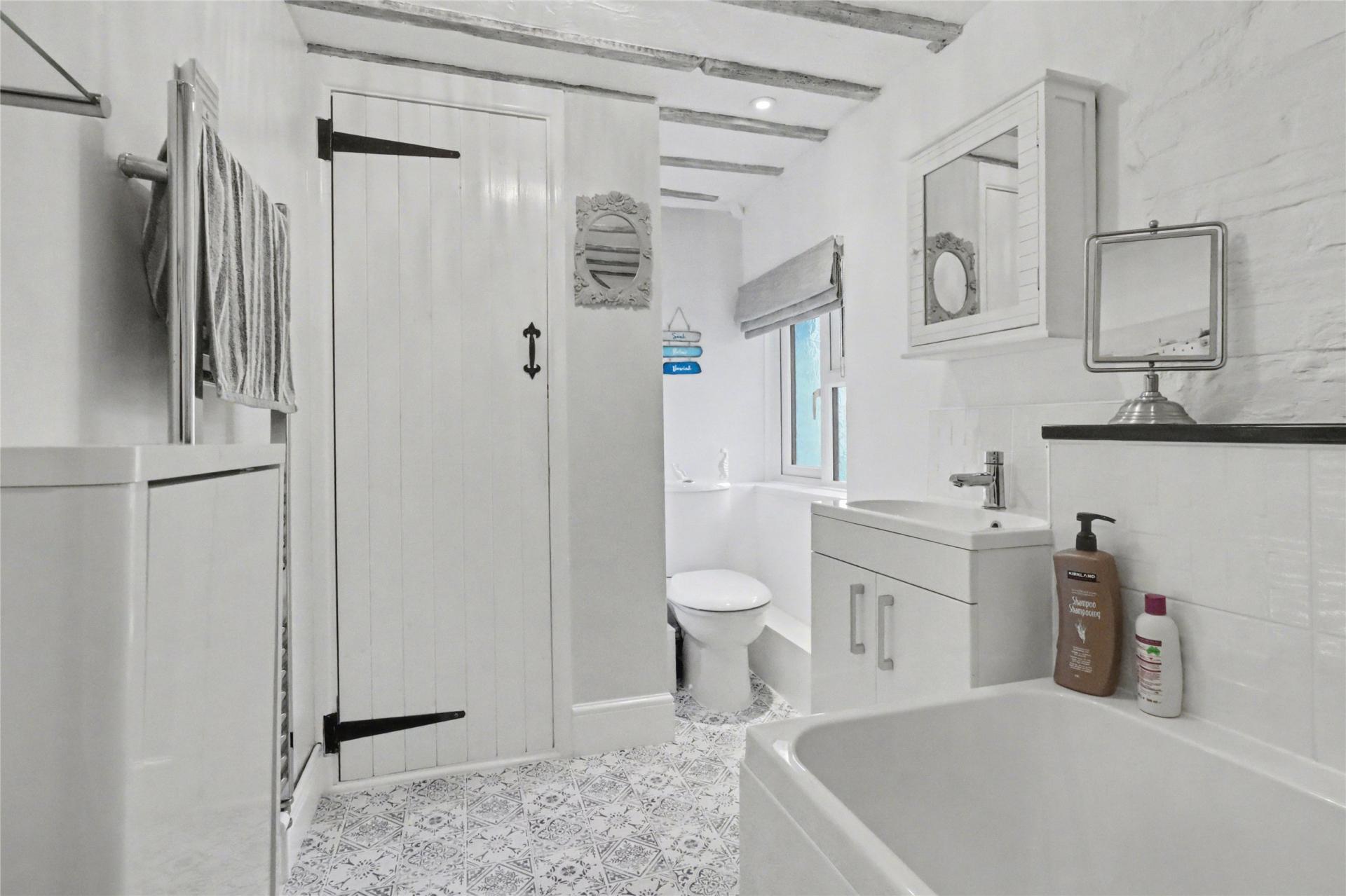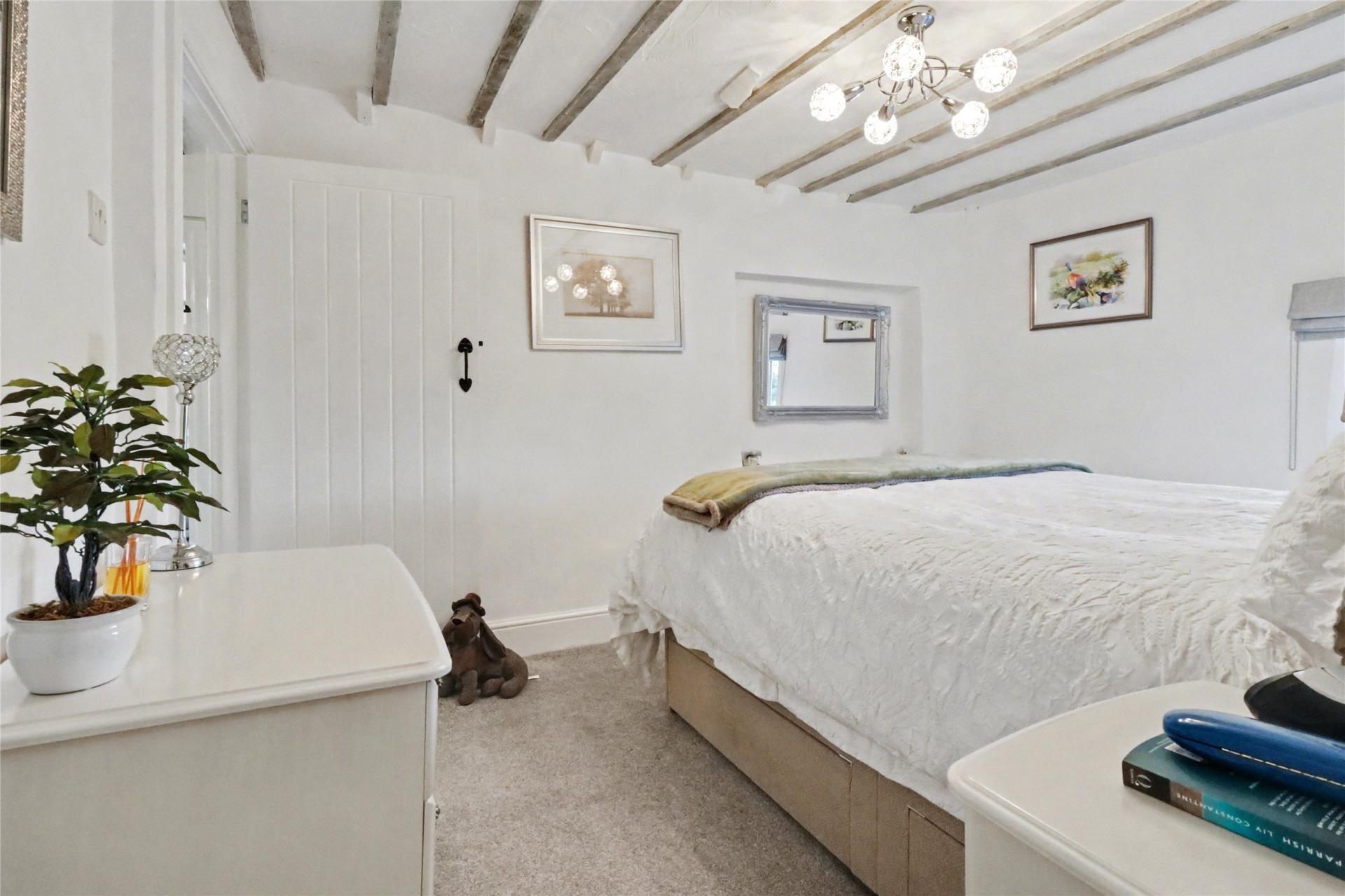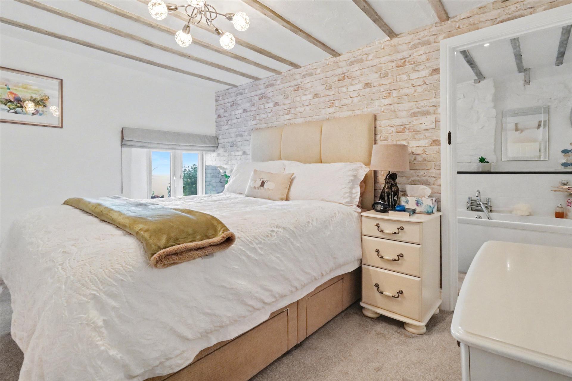 Stairs rise to the first floor. To the left is a spacious double bedroom enjoying countryside views, fitted wardrobes, and access to useful eaves storage. The second double bedroom is also well presented and benefits from an en-suite bathroom in excellent decorative order, fitted with a bath, WC, and wash hand basin. Bedroom three is a good-sized single or small double room, further enhanced by fitted wardrobes.