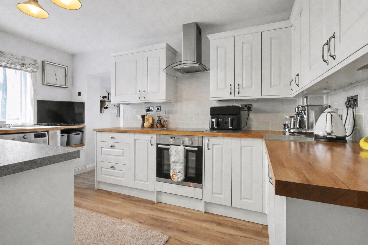 A side gate provides access to the property, leading into a useful entrance porch with space for coats and shoes. This opens into the stunning kitchen/dining/family room, the true heart of the home, featuring attractive matching wall and base units and a central island with seating. A single step leads down into a spacious area that comfortably accommodates both a dining table and seating area, creating an ideal space for family living and entertaining.