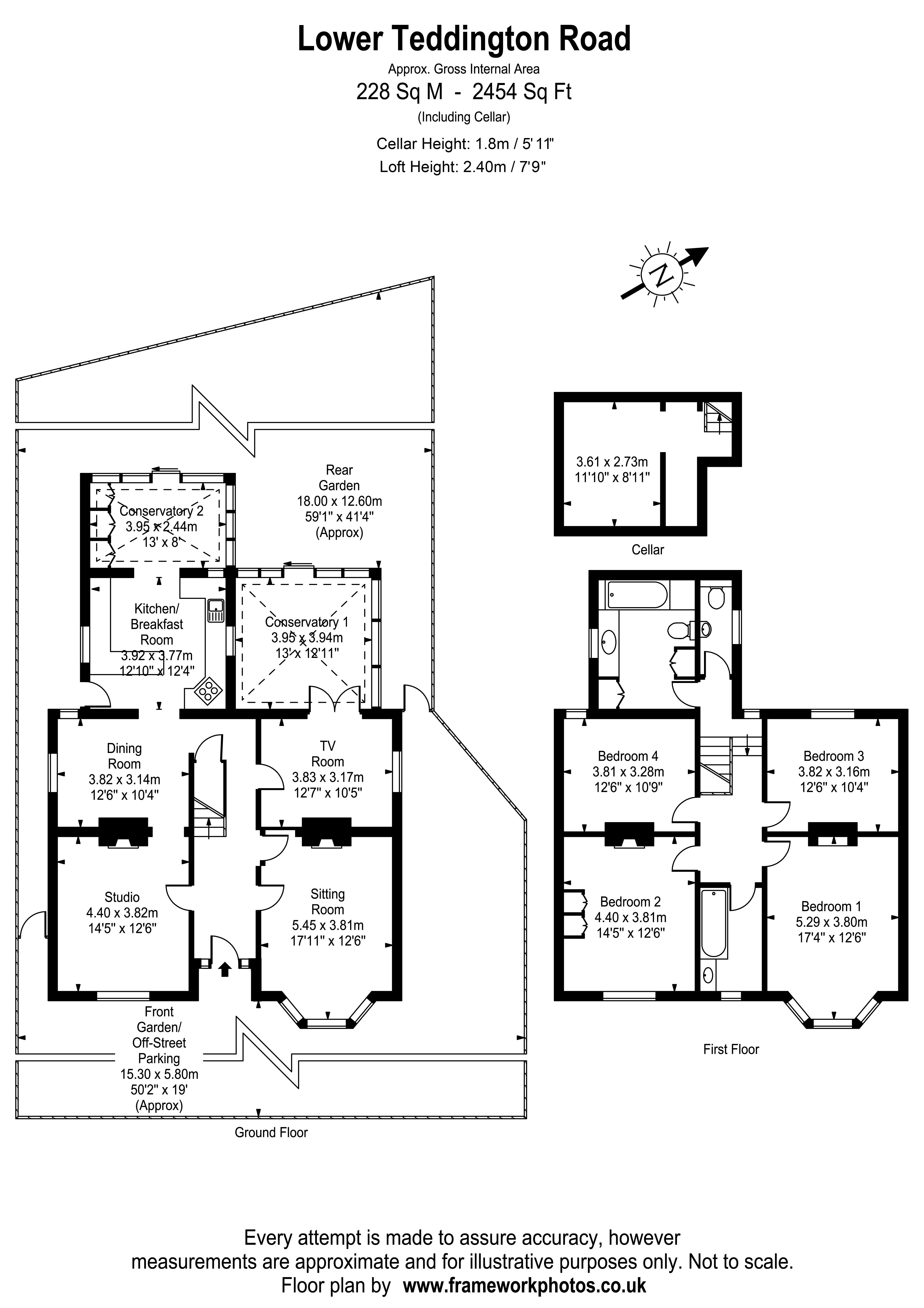 Internally, the accommodation (228 sqm / 2454 sq. ft.) is arranged naturally over two floors with good circulation space from a generous hallway and split-level landing. The ground floor comprises entrance hall with under stair cupboard, four separate reception rooms; the two principal rooms both feature attractive working fireplaces. To the rear, a Smallbone Kitchen / Breakfast room opens to a conservatory, which doubles up as a breakfast room / laundry space, and a further large conservatory off the TV room opens to the garden. A trap door from this conservatory leads to a highly useful cellar with dry storage (13.5 sqm / 145 sq. ft. - head height 1.8m / 5'11").