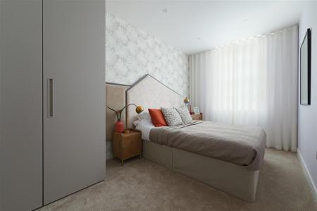 Both bedrooms are generously sized doubles, with the principal bedroom featuring fitted wardrobes. A chic family bathroom with a contemporary vanity basin completes the sleek interior.