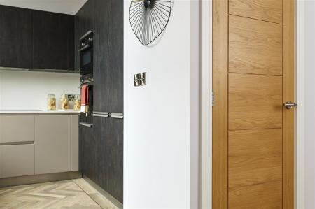 Accessed via its own private entrance with a secure door entry system, the home opens into a welcoming hallway featuring an airing cupboard and elegant herringbone Karndean flooring with underfloor heating, flowing seamlessly throughout.