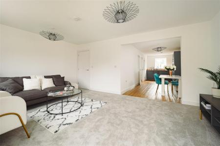 Upon entering, you'll be greeted by a spacious hallway featuring a home office area, a cloakroom and WC. The contemporary open-plan kitchen, dining, and living area is thoughtfully designed to accommodate both entertaining and family life. Patio doors from the lounge lead out to a generous garden, complete with patio and turf. A convenient storage cupboard is located under the stairs.