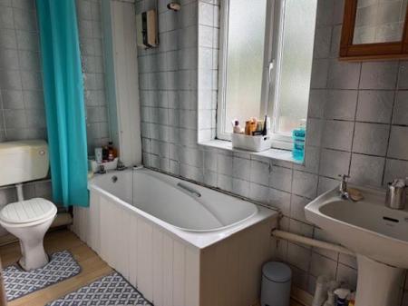 Bathroom with three-piece suite in white comprising of close coupled wc, wash hand basin and bath. Fully tiled and radiator.