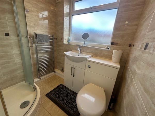 Three piece suite in white comprising; walk in shower enclosure with sliding door and electric shower, close couple vanity basin and wc. Fully tiled, chrome towel radiator and a rear facing uvpc double glazed frosted window.
