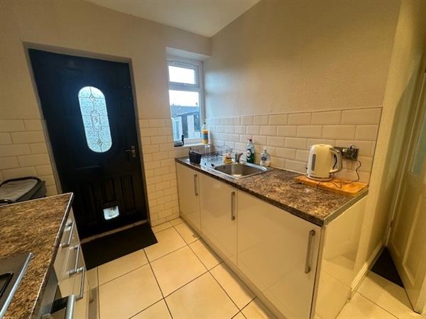 Wide range of wall an base units in a gloss white finish with complimentary worktops and splashback tiling. Built in electric oven, four ring gas hob and canopy style extractor fan. Integrated fridge and washing machine. Single bowl, single drainer stainless steel sink unit with monotap. Space for free stand fridge freezer, rear facing uvpc double glazed window and timber door to rear garden
