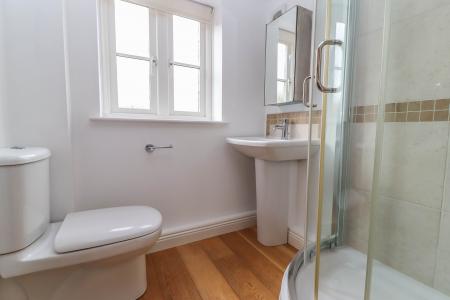 SHOWER ROOM White suite comprising pedestal wash hand basin with mixer tap, tiled splash back and mirror fronted cabinet above. Low level WC. Corner tiled shower cubicle. Oak flooring. Obscure glazed window to front aspect. LED down lighter. Extractor fan.