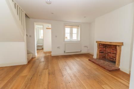 SITTING ROOM Attractive open brick fireplace (currently not in use) with electric stove effect heater on brick hearth with oak surround. Oak flooring. Window to front aspect. LED down lighters. Turning staircase rising to first floor with understairs dining area. Oak latch door into kitchen.