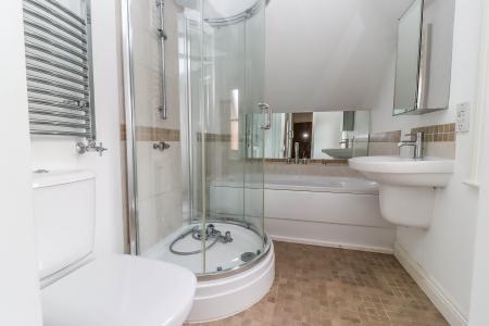 LUXURY EN SUITE BATHROOM White suite comprising wall hung wash hand basin with mixer tap, tiled splash back, mirror fronted cabinet above and shaver socket. Panelled bath with mixer tap. Circular tiled shower enclosure. Low level WC. Chrome towel radiator. Tiled floor. Obscure glazed window to side aspect. LED down lighter. Extractor fan.