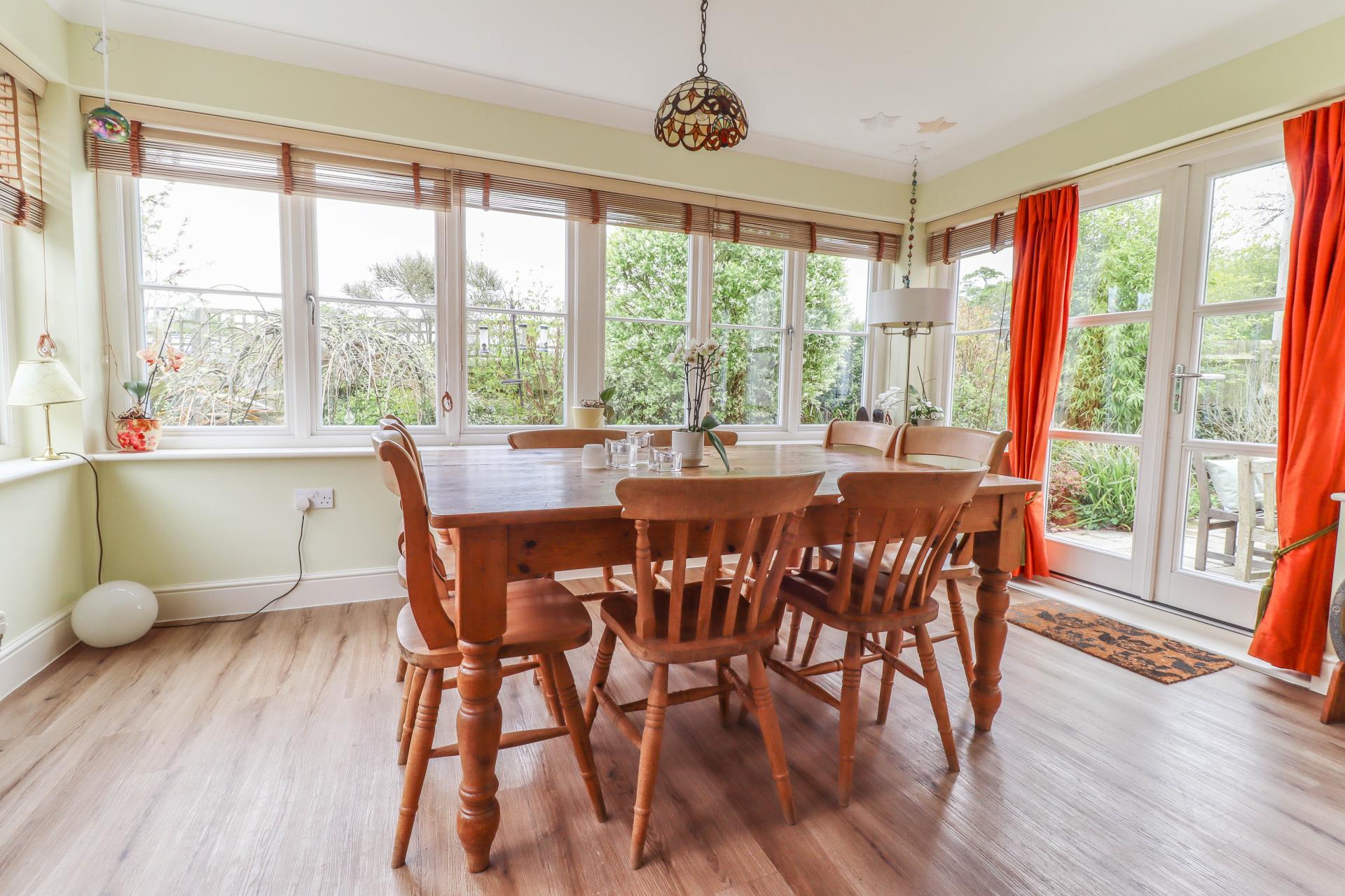 GARDEN ROOM Windows along three aspects and double doors to one end opening onto a terrace. Coving. Ceiling light points.