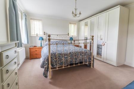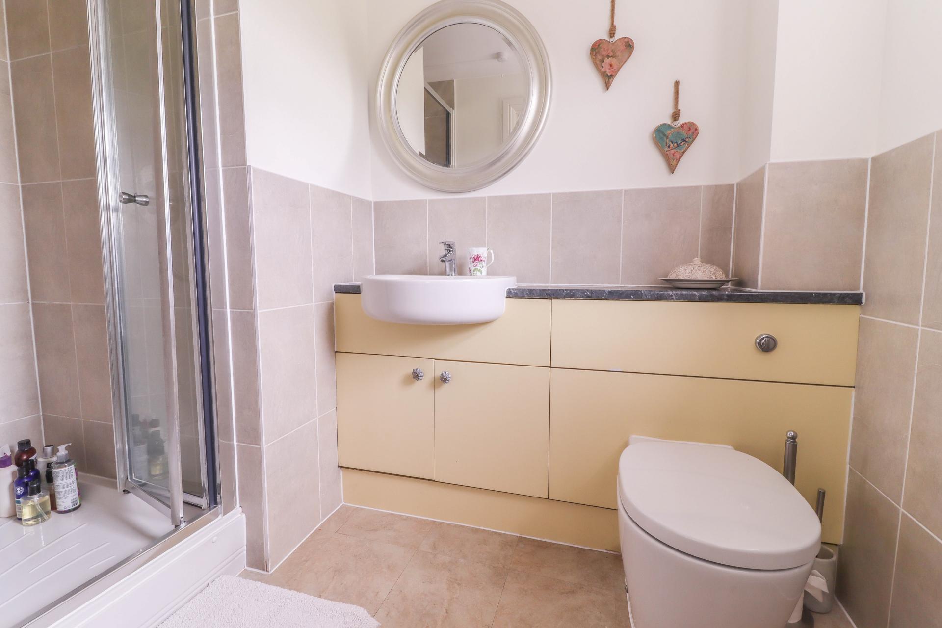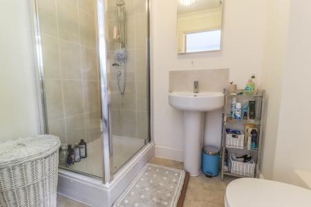 En Suite Shower Room White suite comprising a contemporary wash hand basin set into roll top surround, double cupboard beneath. Low level WC with concealed cistern. Folding door into fully tiled cubicle with Mira Flight shower. Extractor fan. Ceiling light point. Coving. Wall light point/shaver socket. Towel radiator. Part ceramic tiled walls.
