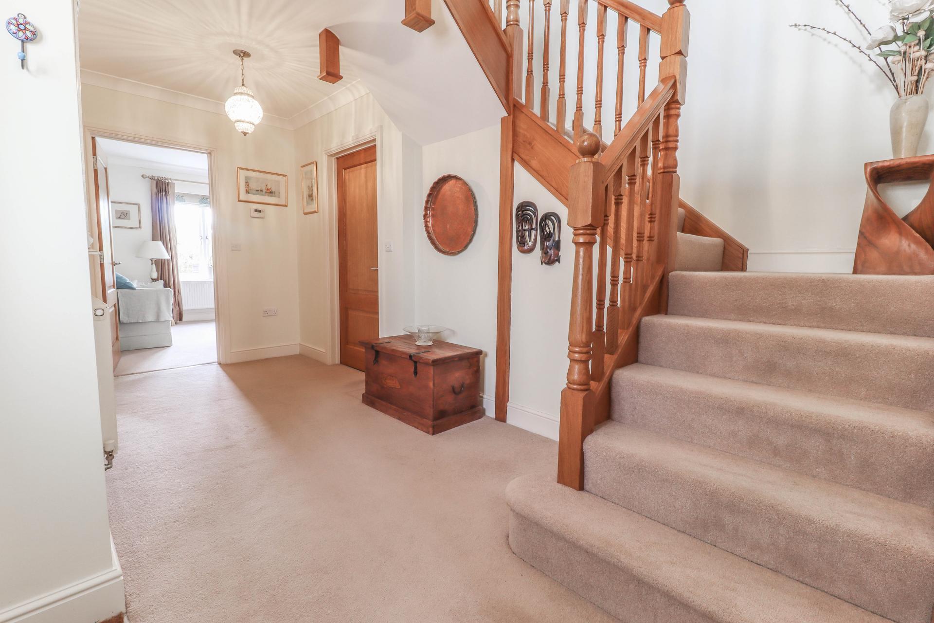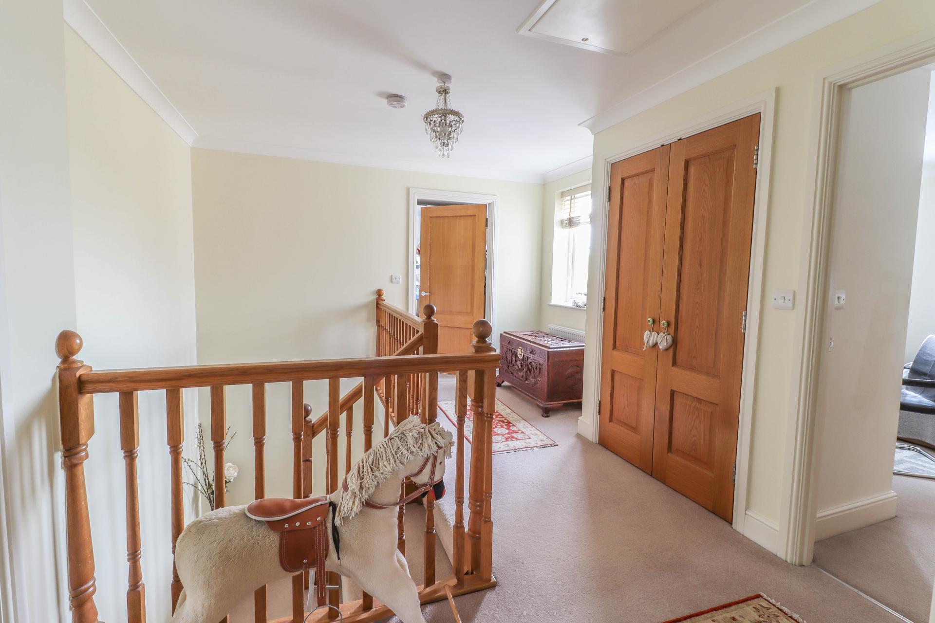 LARGE CENTRAL LANDING Solid oak balustrade continues overlooking stairwell. Window to side aspect with views towards farmland. Access to loft space via hatch. Central ceiling light point. Coving. Solid core oak doors to bedrooms, family bathroom and double oak doors to a large cupboard housing pressurised hot water cylinder and slatted shelving.