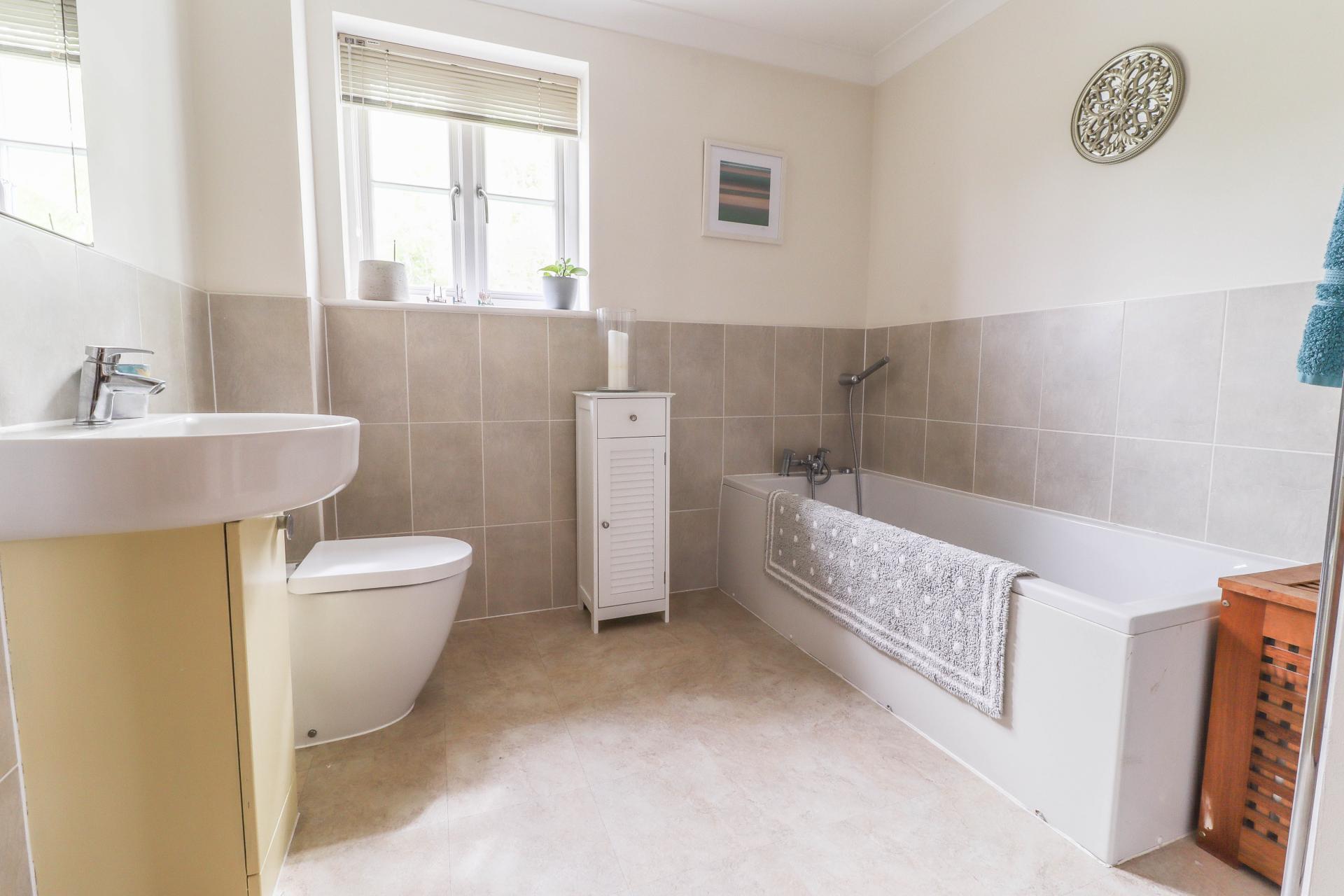 FAMILY BATHROOM White suite comprising contemporary wash hand basin, cupboard beneath. Low level WC. Panelled bath with part tiled surround and mixer tap/hand held shower attachment. Obscure glazed window to side aspect. Extractor fan. Ceiling light point. Coving. Towel radiator.