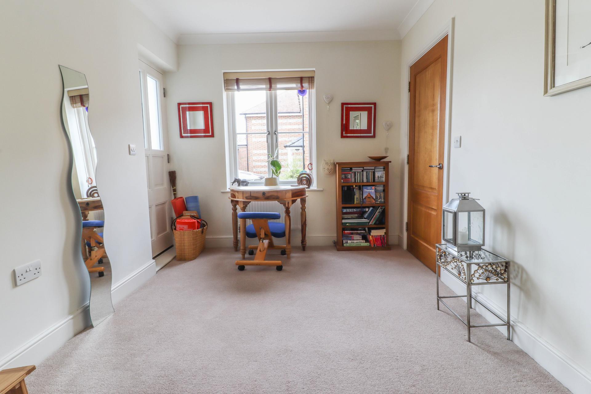 FAMILY ROOM / HOME OFFICE Window to side aspect overlooking garden. Further window to opposite side overlooking driveway. Two ceiling light points. Coving. Part obscure glazed external door to front drive.