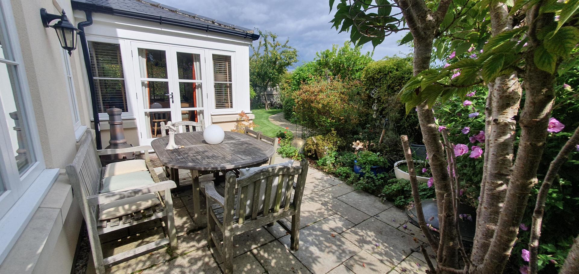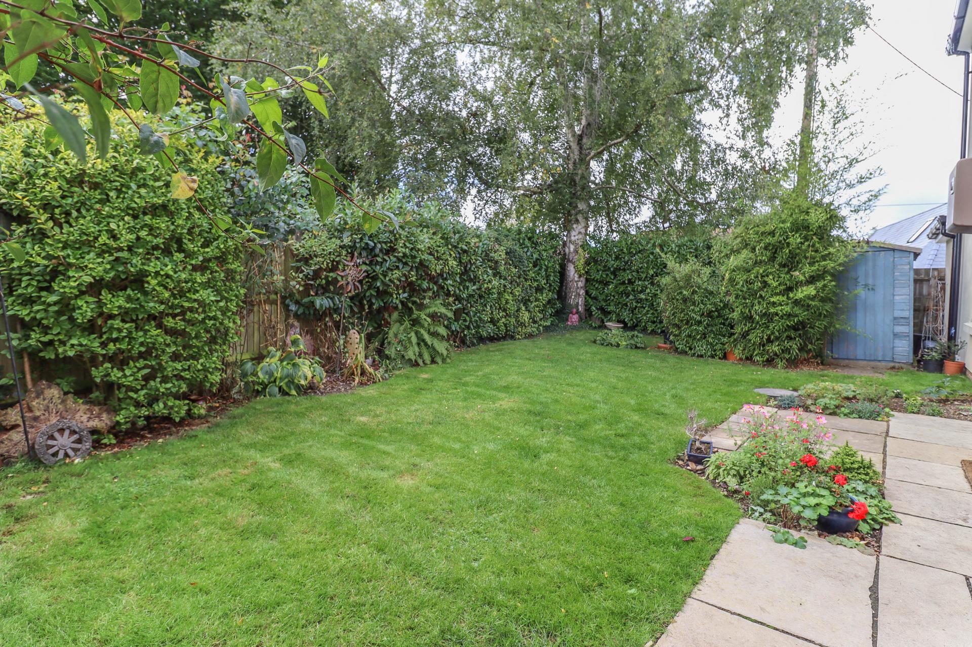 THE GARDEN The remaining wrap-round well enclosed garden comprises a natural stove terraces areas linked by paths separating well stocked borders and lawned areas. The garden is well enclosed on all sides by tall weather board fencing with trellis above and trees.