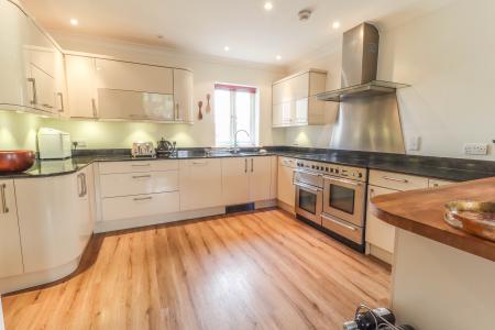 Kitchen 1½ bowl sink unit with mixer tap. Extensive range of high and low level cupboards and drawers. Rangemaster Toledo two oven range with plate warmer and grill, ceramic five ring hob and warmer to side, stainless steel splash back with suspended stainless steel/glass hood above. Integrated Hotpoint dishwasher. Polished granite work surfaces with similar upstand. Peninsular unit with solid oak butcher block top and breakfast bar. Halogen ceiling down lighters. Coving. Plinth heater. Window to front aspect with views towards farmland.