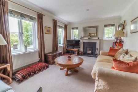 SITTING ROOM Inset log burning stove with granite surround, granite hearth and attractive classic limestone mantelpiece. Two windows to rear aspect. Two further casement windows to side aspect. Two ceiling light points. Coving. Two wall light points.