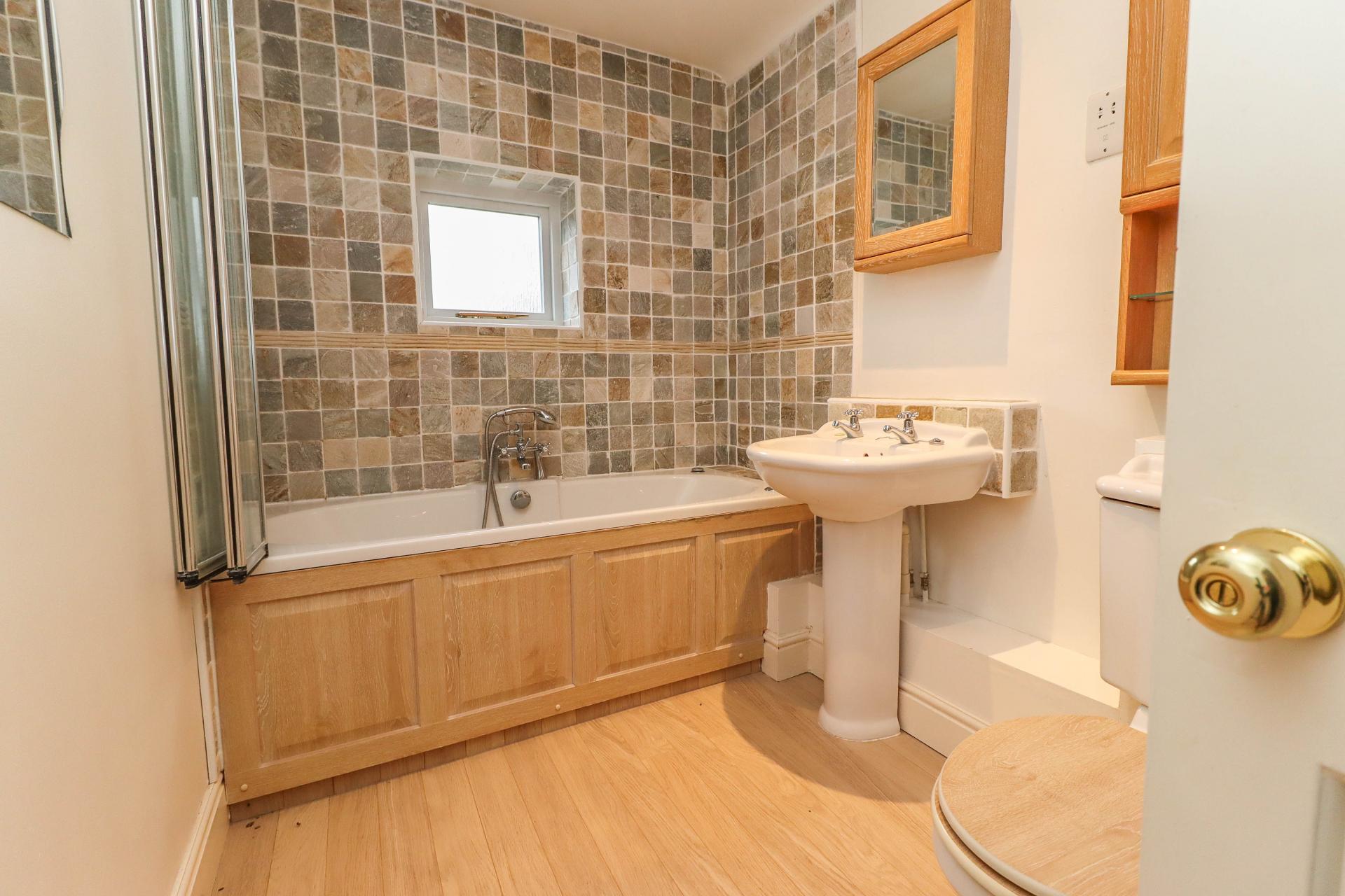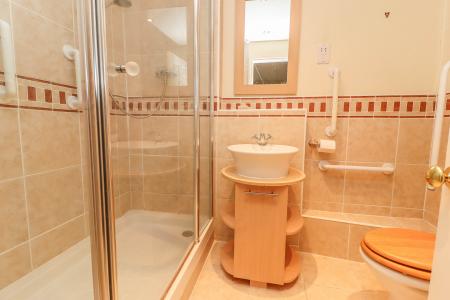 FAMILY BATHROOM White suite comprising pedestal wash hand basin, deep double ended jacuzzi bath, central mixer tap/handheld shower attachment, attractively tiled surround, folding glass shower screen. WC. Chrome towel radiator. Shaver socket. Cupboards. LED down lighters.