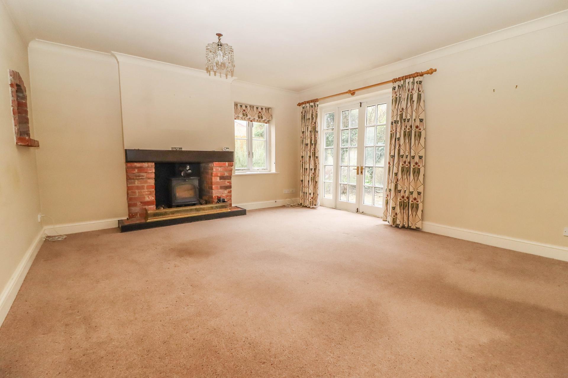 LIVING ROOM (Triple aspect) Open brick fireplace housing rolled steel log burning stove on raised brick hearth with timber edge and beam above. Small pane glazed doors with glazing to either side opening onto the side patio and rear garden. Window to rear aspect overlooking garden. Further high window to side aspect. Coving. Two pendant light points.