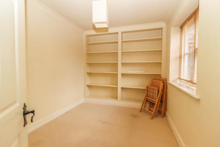 STUDY Window to front aspect. Floor to ceiling full width shelving to one wall. Coving. Pendant light point.