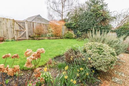 MAIN REAR GARDEN (Westerly aspect) This comprises a flagstone patio area ideal for barbeques and entertaining, surrounding gravel and shrubs. Sleeper steps rise onto a small shaped lawn with well stocked surrounding herbaceous borders. Timber shed. Boundaries are enclosed by fencing and some hedging plants. Gate from the rear gate leads out to a tandem parking area. Further parking space to the front with a single garage in a block of four. Brick elevations beneath a slate roof. Up and over door to front.