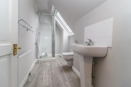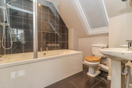 LARGE EN SUITE BATHROOM White suite featuring a large double ended bath with central taps, tiled surround and wall mounted shower with glass screen. Pedestal wash hand basin. Low level WC. Ceramic tiled floor. Chrome towel radiator. Velux window to side aspect. LED down lighter.