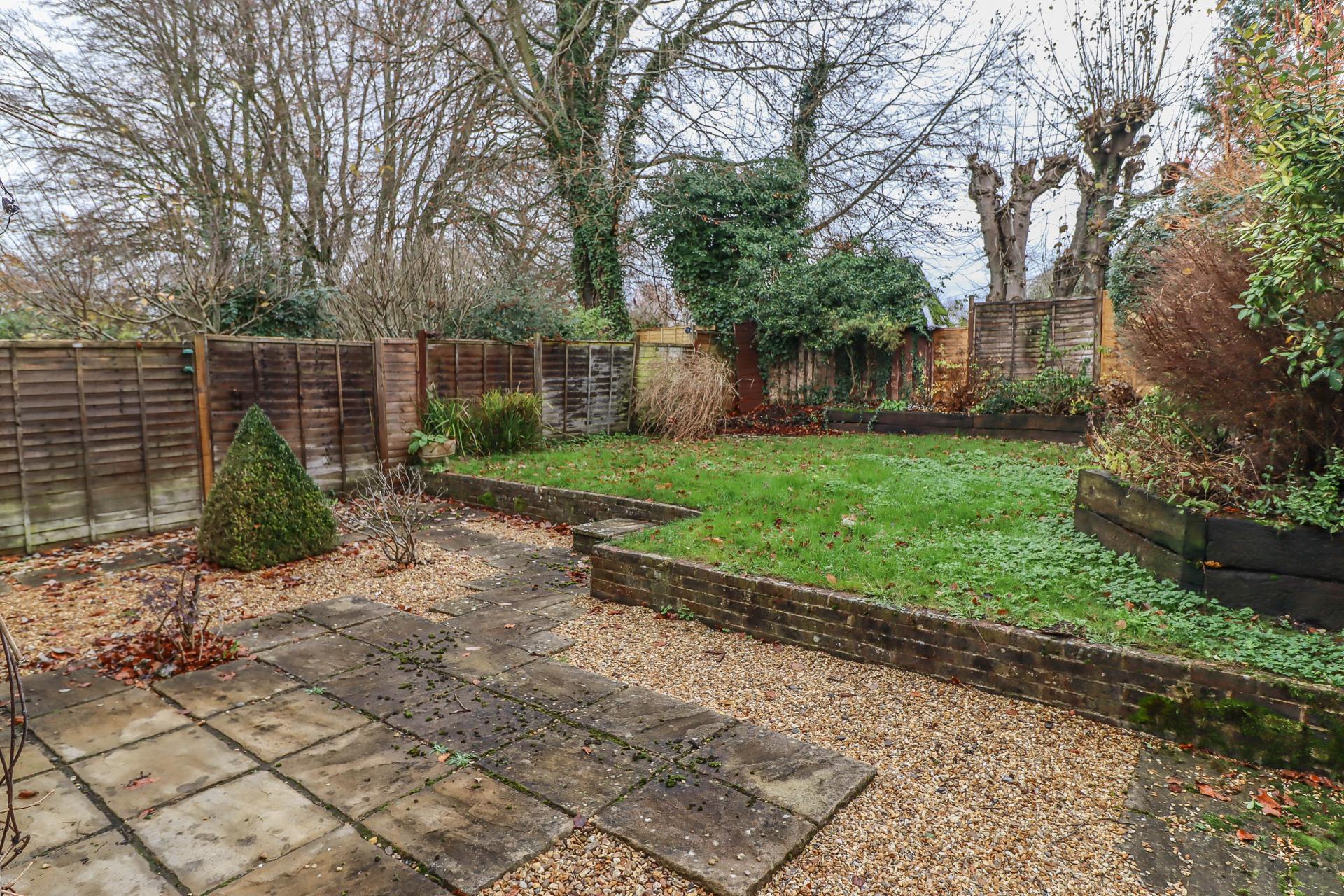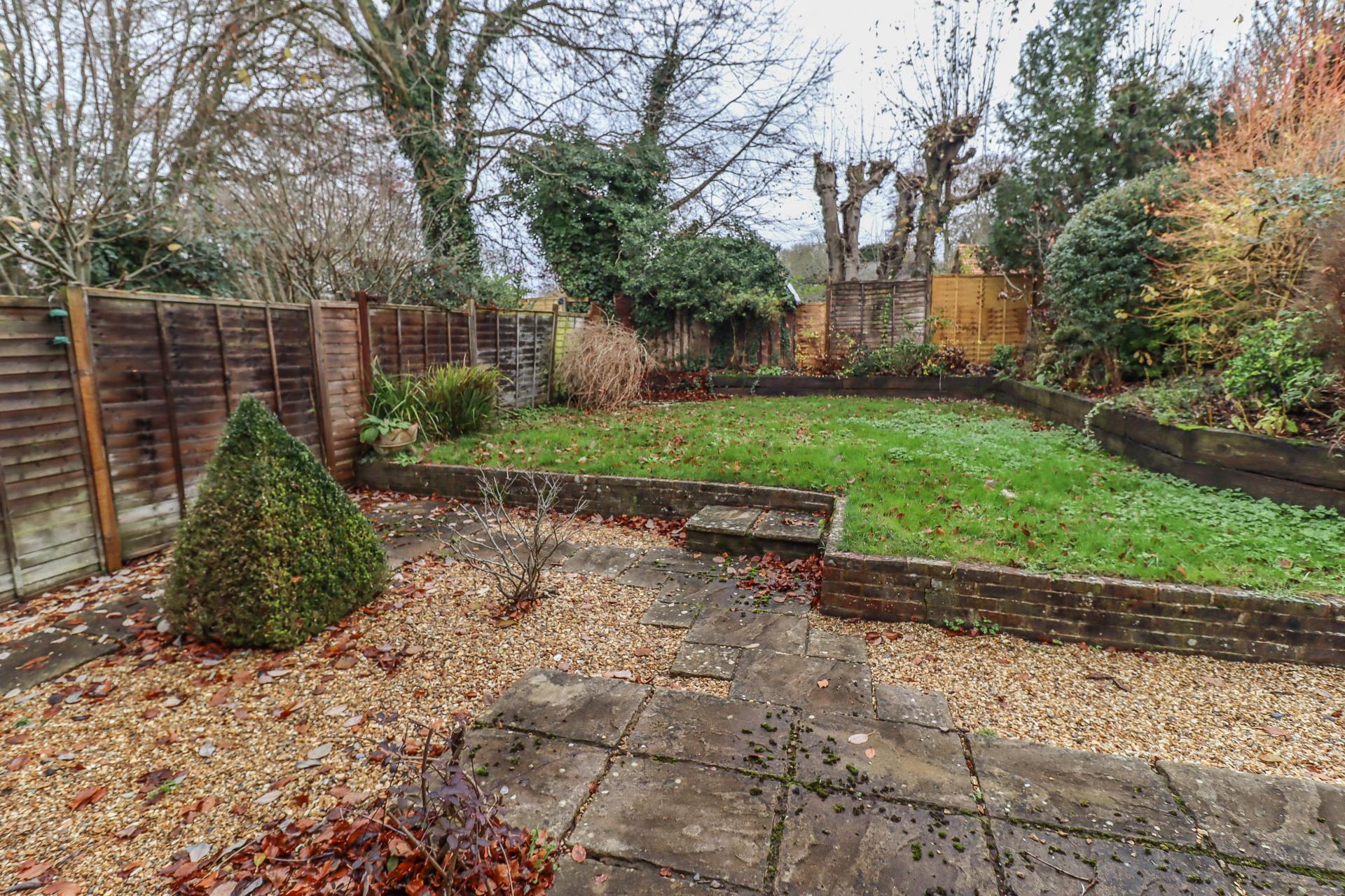 MAIN REAR GARDEN This comprises a paved/gravelled terrace with step up onto a level lawn, surrounded by sleeper retained flower and shrub borders, all well enclosed by fencing.