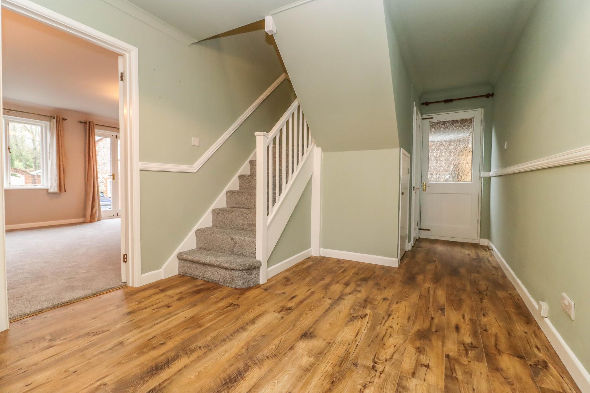 LARGE RECEPTION HALL Turning staircase with half landing rising to first floor. Oak effect flooring. Understairs cupboard. Pendant light point. Coving. Obscure glazed door to side aspect. Part obscure glazed door to rear path. Half obscure glazed door to side porch with path leading to rear garden. Panel doors to living room, open plan kitchen with adjoining dining/sitting room, cloakroom and cloaks cupboard with light.