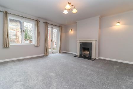 LIVING ROOM (Good size reception room) Open fireplace with granite surround and hearth, stone mantelpiece. Window and glazed double doors to side aspect. Pendant light point. Wall lights. Coving.