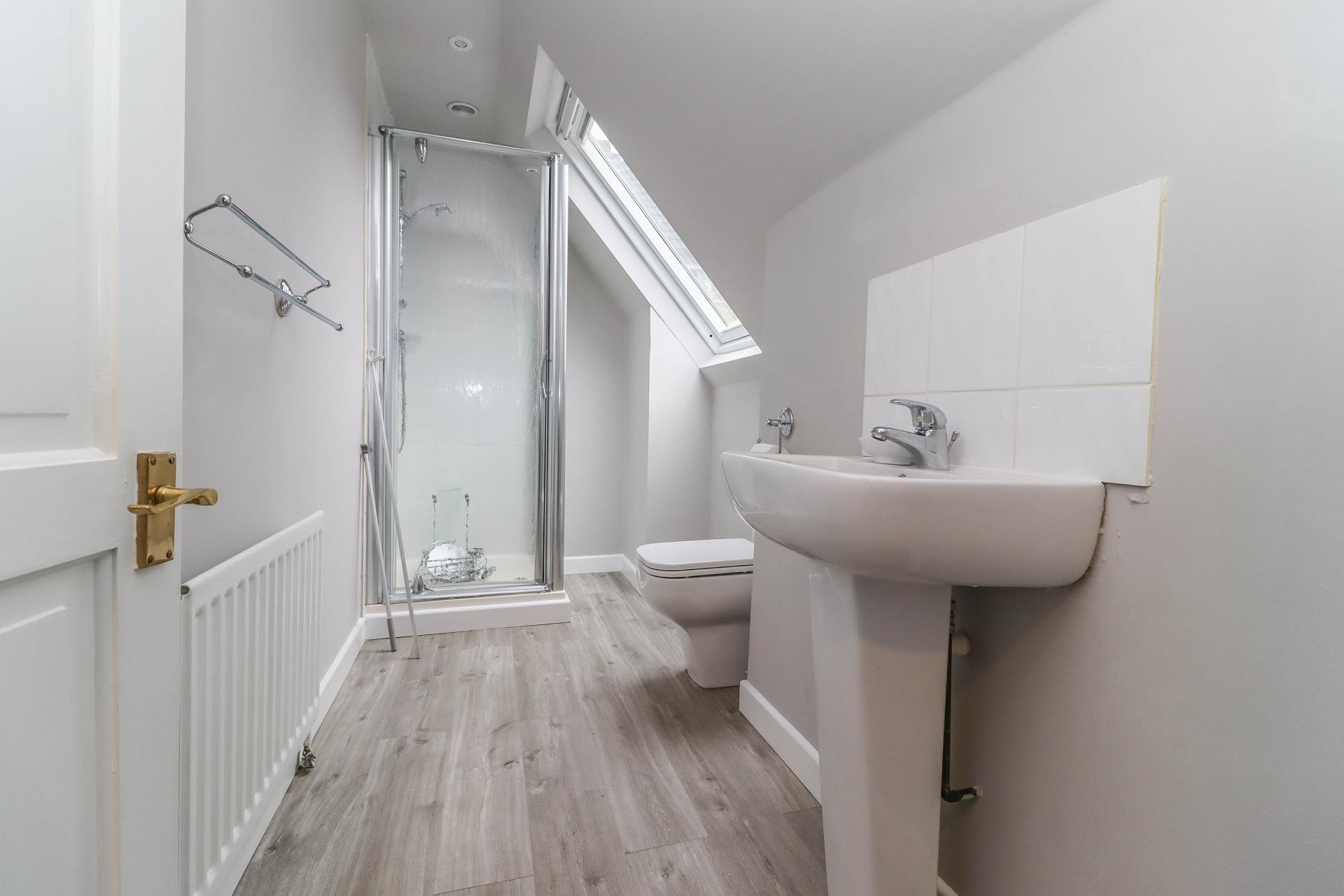 FAMILY SHOWER ROOM White suite comprising pedestal wash hand basin with mixer tap and tiled splash back. Low level WC. Glass/tiled enclosure with Mira shower. Limed oak effect flooring. Velux window LED down lighters. Extractor fan.