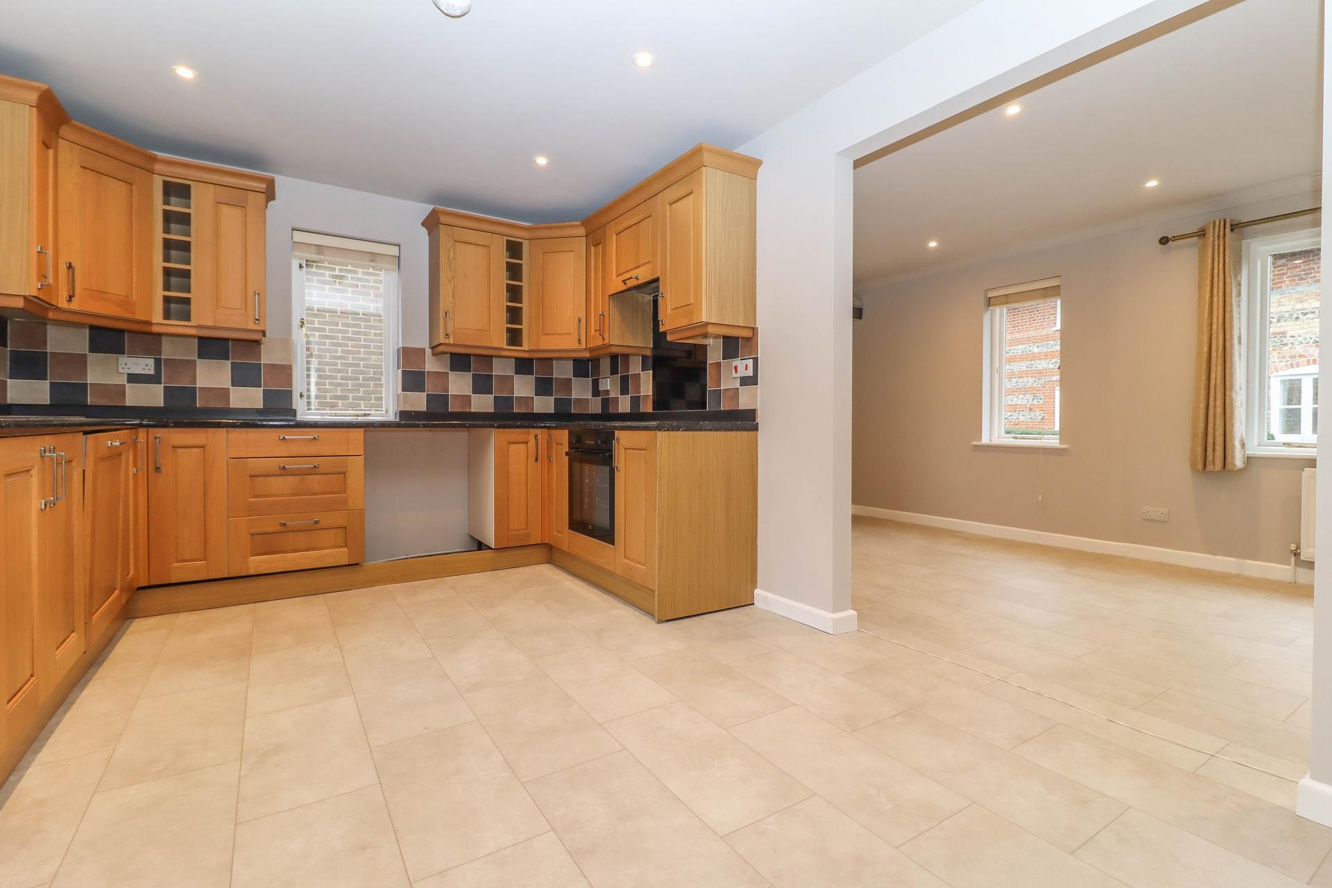 KITCHEN Stainless steel 1½ bowl sink unit with mixer tap and drainer. Range of oak effect high and low level cupboards and drawers. Roll top granite effect work surfaces with similar upstand and ceramic tiled splash back. Under-counter oven with grill. Four ring ceramic hob with glass splash back and extractor hood above. Integrated dishwasher. Under-counter recesses for fridge, freezer and washing machine. Grant oil fired boiler. Windows on two aspects. LED down lighters. Stone effect flooring. Opening into: