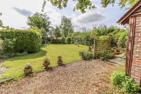 MAIN REAR GARDEN Comprises several seating areas with large lawn, well enclosed by hedging and trellis covered with climbing plants. Well stocked shrub and rose borders. Fruit trees. Opening in the hedging at far side boundary into a kitchen garden area with large aluminium frame greenhouse, timber garden shed and raised beds and orchard area, well enclosed by mature hedging. Wide gated paved path at gable end of the property leads round to: