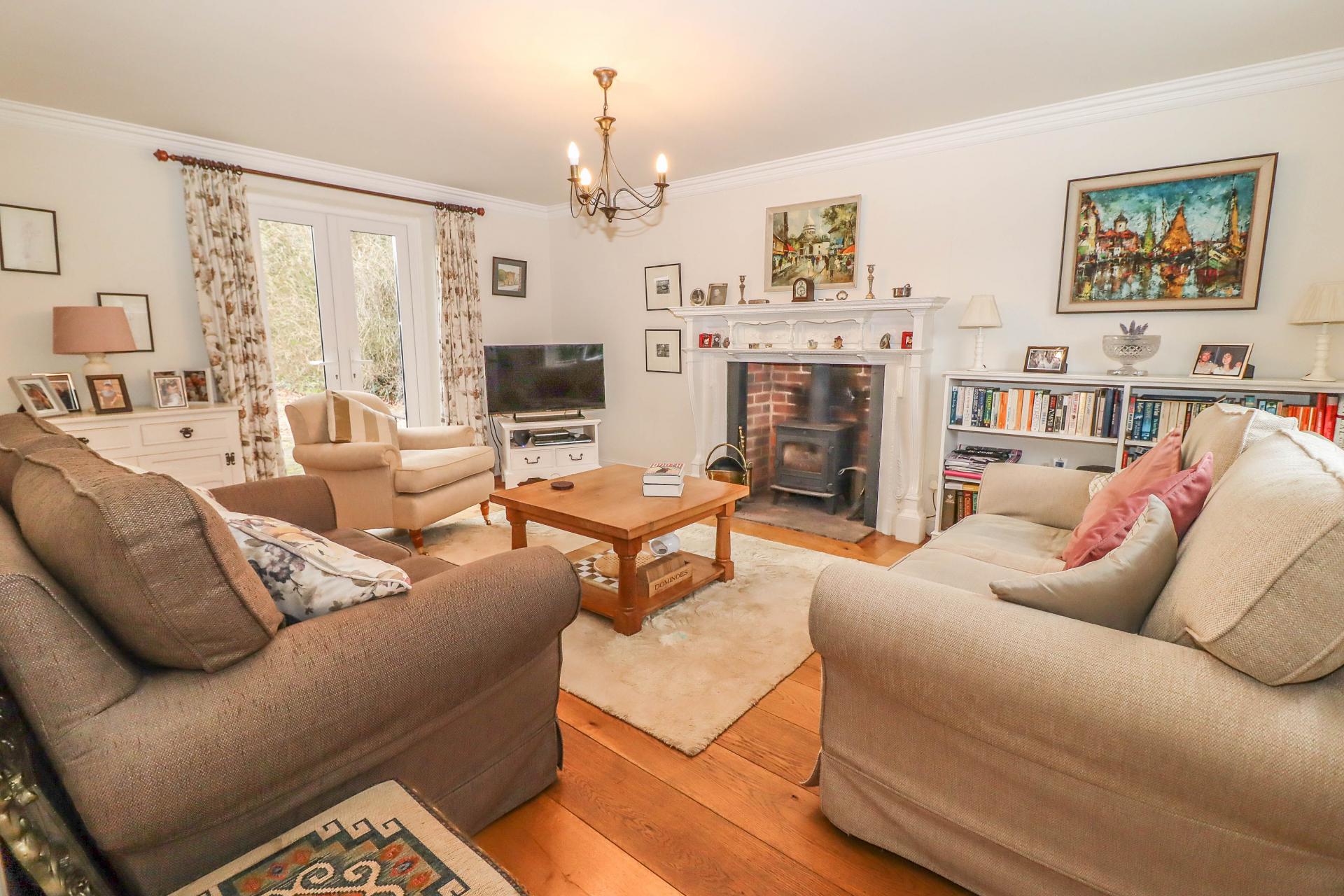 LIVING ROOM (Large dual aspect reception room) Open brick fireplace housing rolled steel log burning stove on stone hearth with elaborate mantelpiece with display shelving. Glazed double doors to rear aspect. Window to front aspect. English oak exposed floor boards. Cornice and central pendant light point.