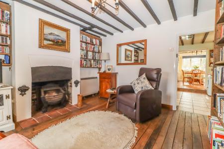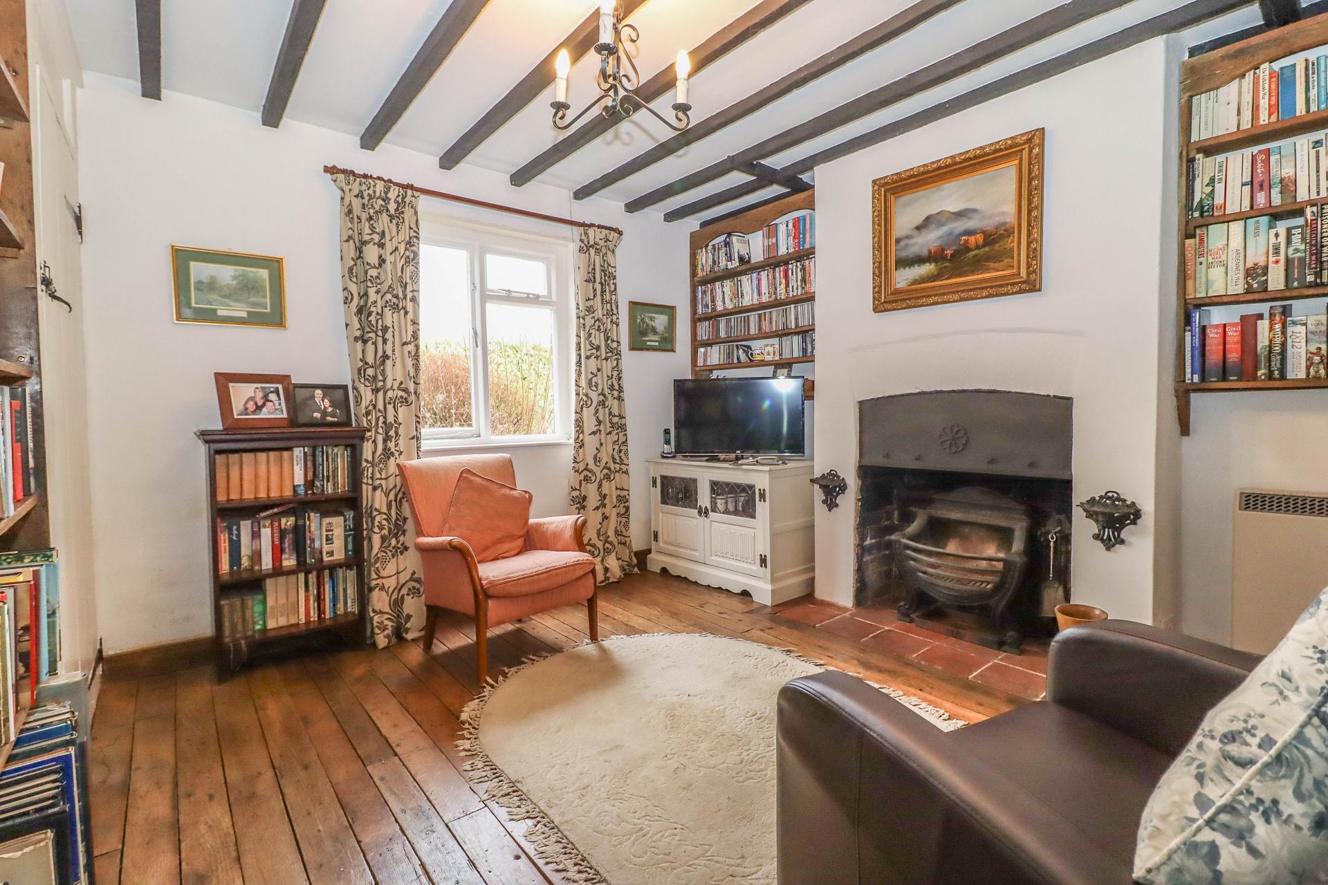 SITTING ROOM (Cosy reception room) Exposed oak floor boards. Open fireplace with cast iron grate and oak edged quarry tiled hearth. Recess to either side of chimney breast with shelving. Exposed ceiling joists. Pendant light point. Window to front aspect. Full height shelving and door to side into understairs cupboard. Ledged latch door into:
