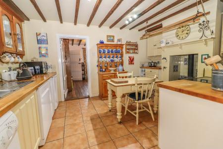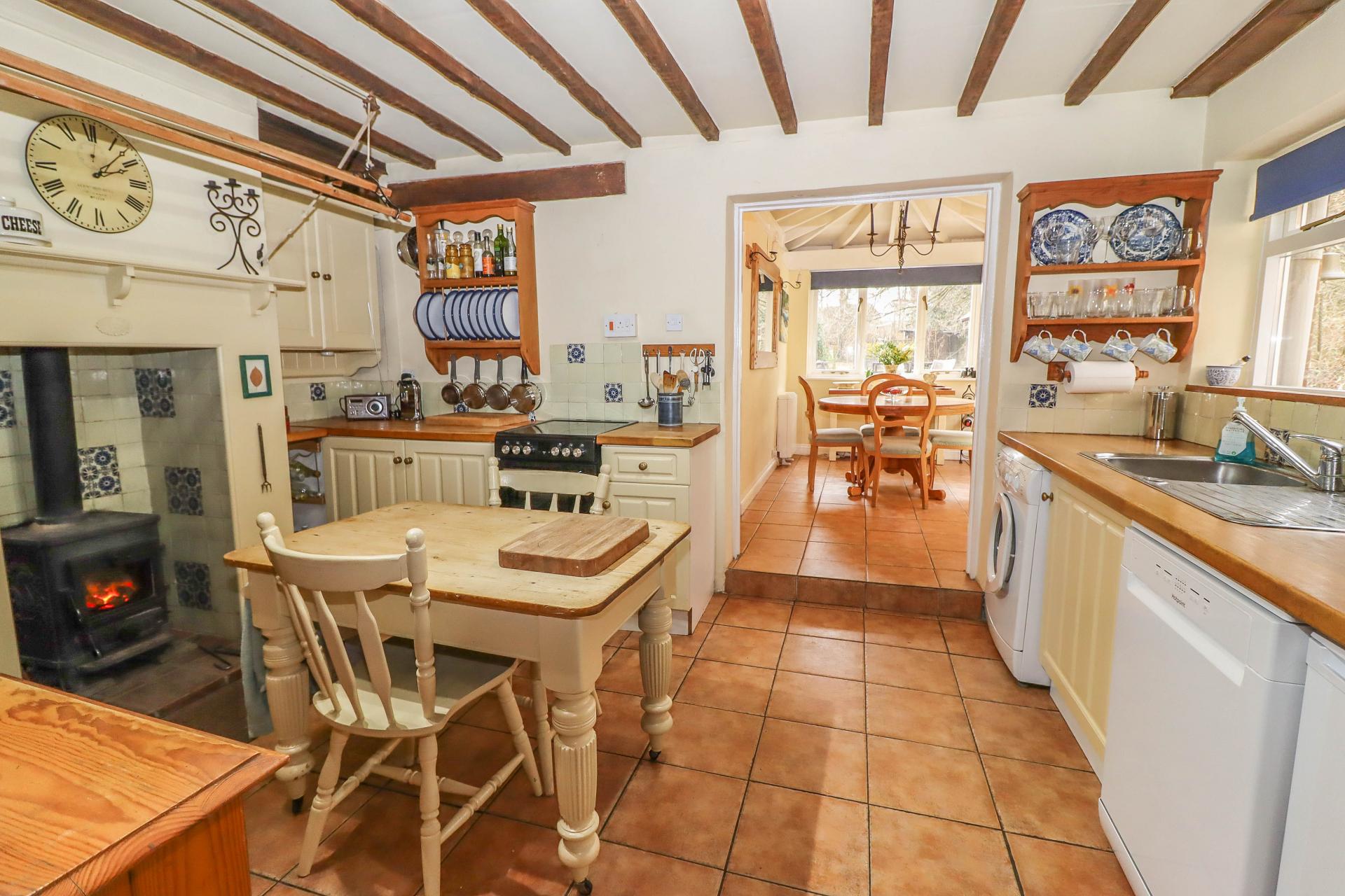 FARMHOUSE STYLE KITCHEN Open fireplace housing Morsø cast iron multi-fuel stove with hand painted ceramic tiled surround on quarry tiled hearth, display sill over. Stainless steel sink unit with mixer tap and drainer. Solid beech block work surfaces with hand painted ceramic tiled splash backs. Range of low level cupboards and drawers. Wine racking. Slim-line Kenwood cooker with two ovens, grill and four ring ceramic hob. Recess and plumbing for dishwasher and washing machine. Space for under-counter fridge and freezer. Ceramic tiled floor. Window to side aspect. High ceiling with exposed joists and LED spot lights. Step up into: