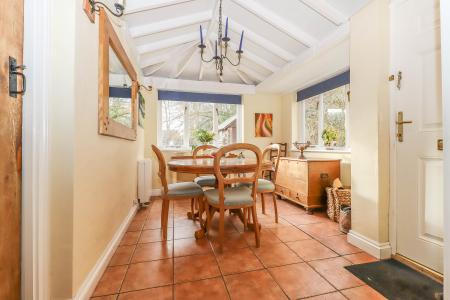 DINING ROOM Vaulted ceiling with exposed framework. Windows to side and rear aspect. Ceramic tiled floor. Wall lights. UPVC door to side aspect opening onto driveway. Pine latch door into: