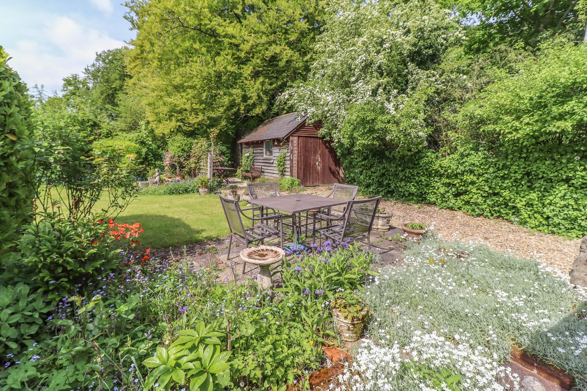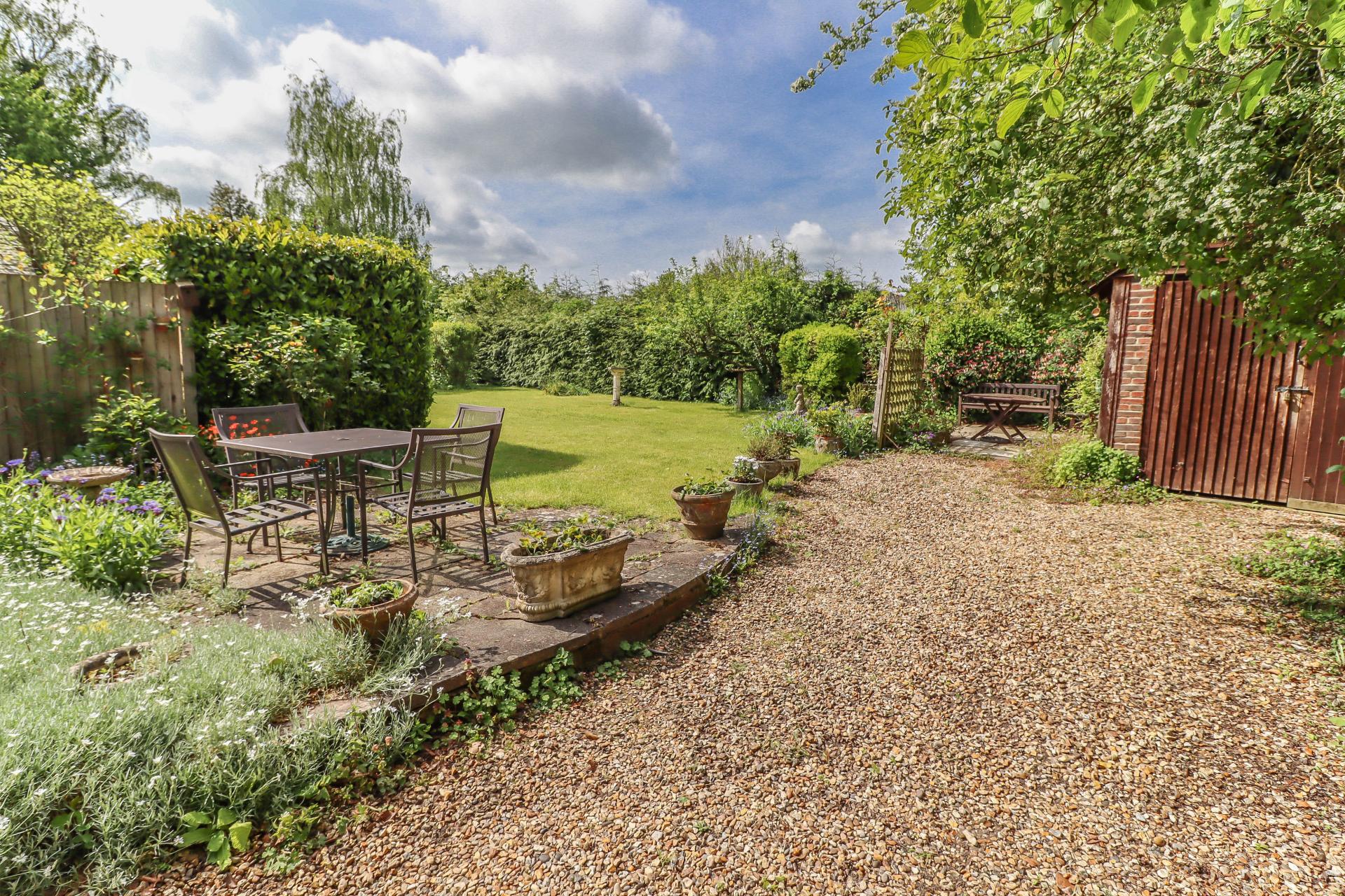 FRONT GARDEN Well enclosed by hedging and trees. Wild flowering cherry. Box hedging. Lawns with gravel and shrub borders. Flint edged ornamental pond (currently not in use).