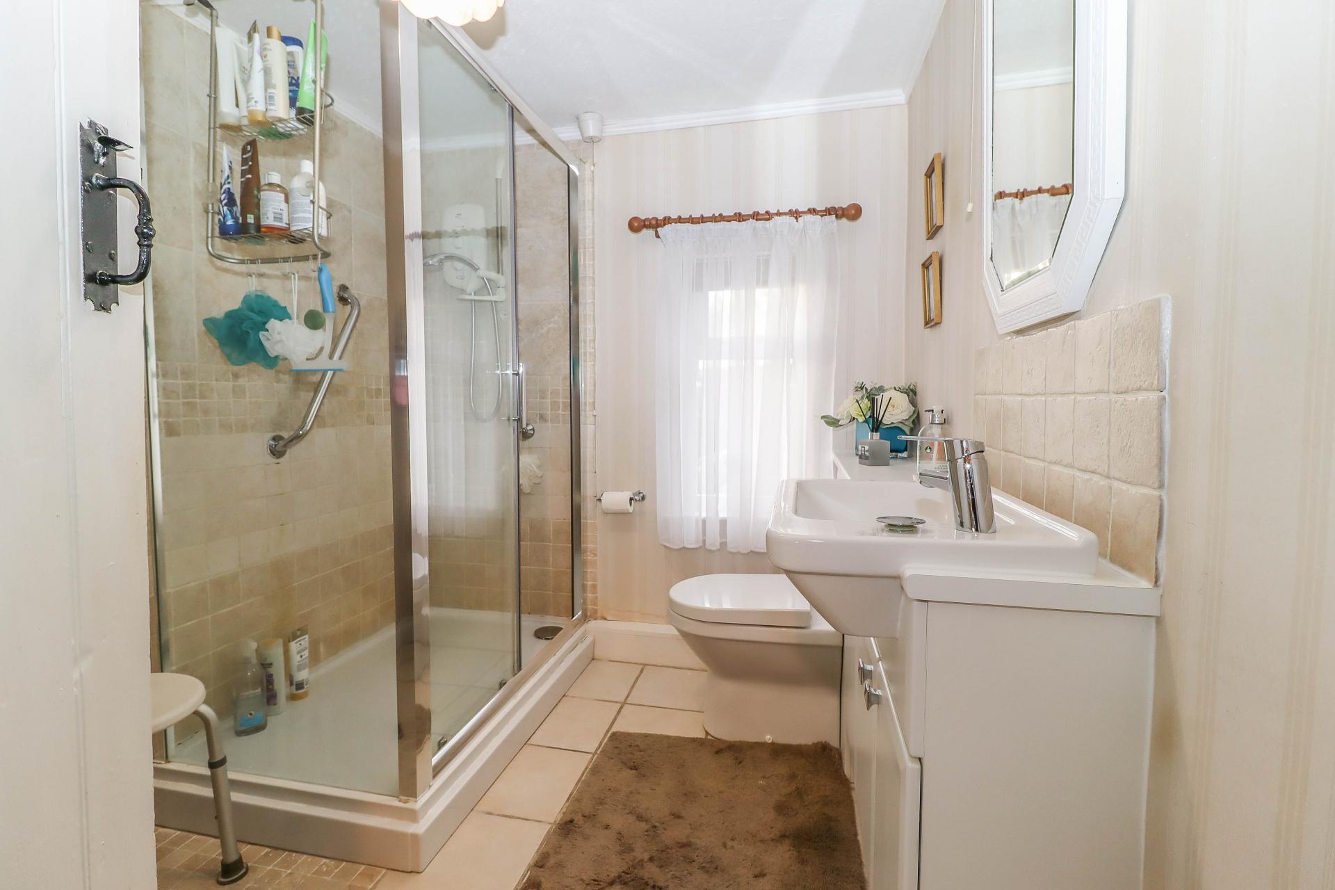 SHOWER ROOM (Ample space for bath with shower over, if preferred) White suite comprising wash hand basin with mixer tap and tiled splashback set into roll top sill, cupboards beneath and low level WC with concealed cistern to side. Sliding glass door into large enclosure with electric Mira Sport shower. Tiled floor. Window to rear aspect. Pendant light point.