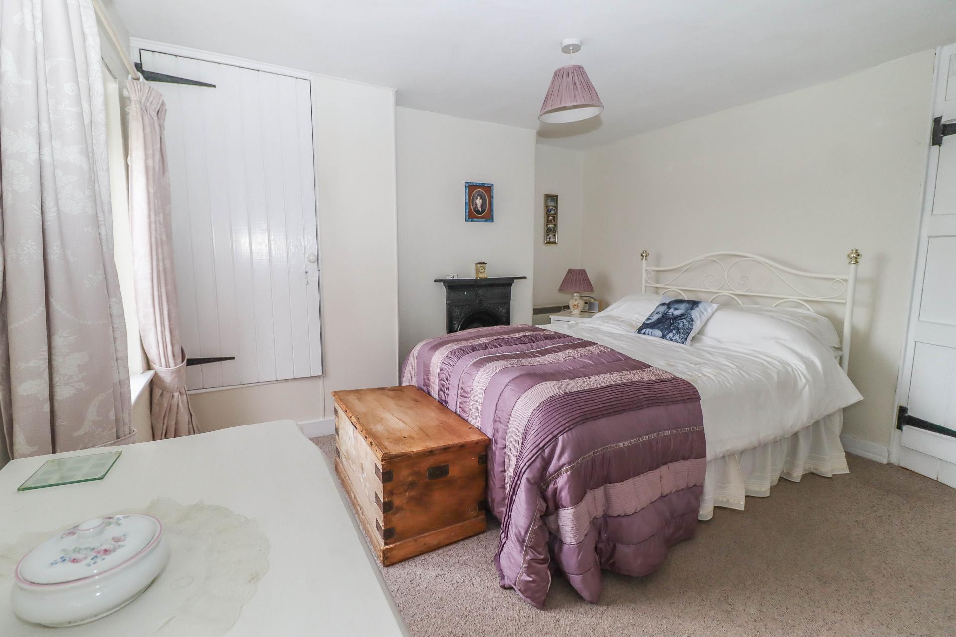 BEDROOM TWO (Double bedroom) Exposed T&G panelling to side of staircase. Cupboard over stair bulkhead. Built-in wardrobe cupboard to one side of chimney breast with cast iron fireplace (not in use). Two windows to front aspect with far reaching views toward farmland and countryside. Alcove. Pendant light point.