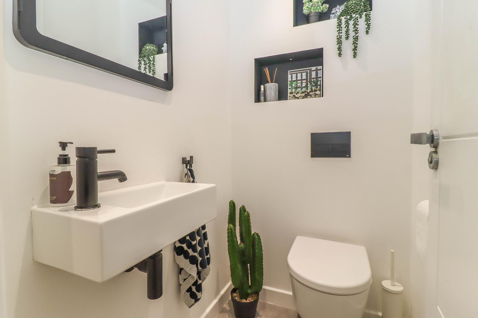 CLOAKROOM Contemporary white suite comprising wall hung basin with mixer tap and low level WC with concealed cistern. Display recesses. LED down lighters. Extractor fan. Porcelain tiled floor with under floor heating.